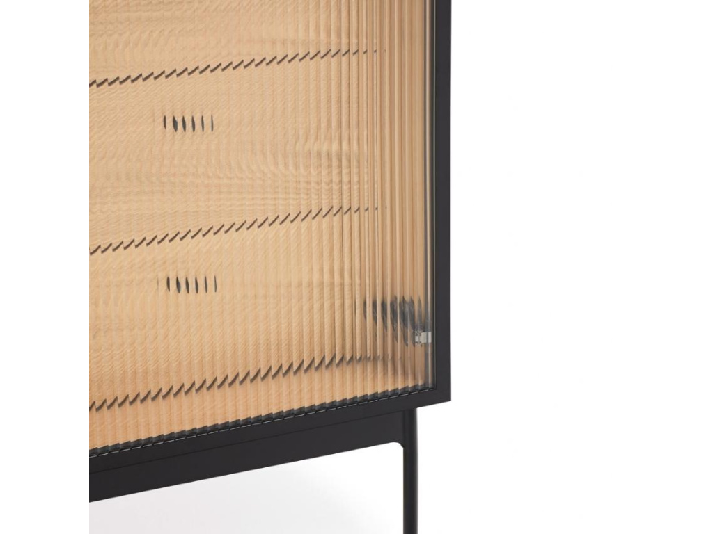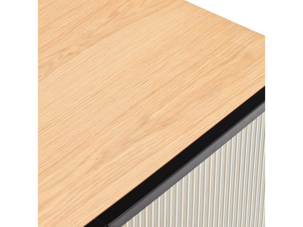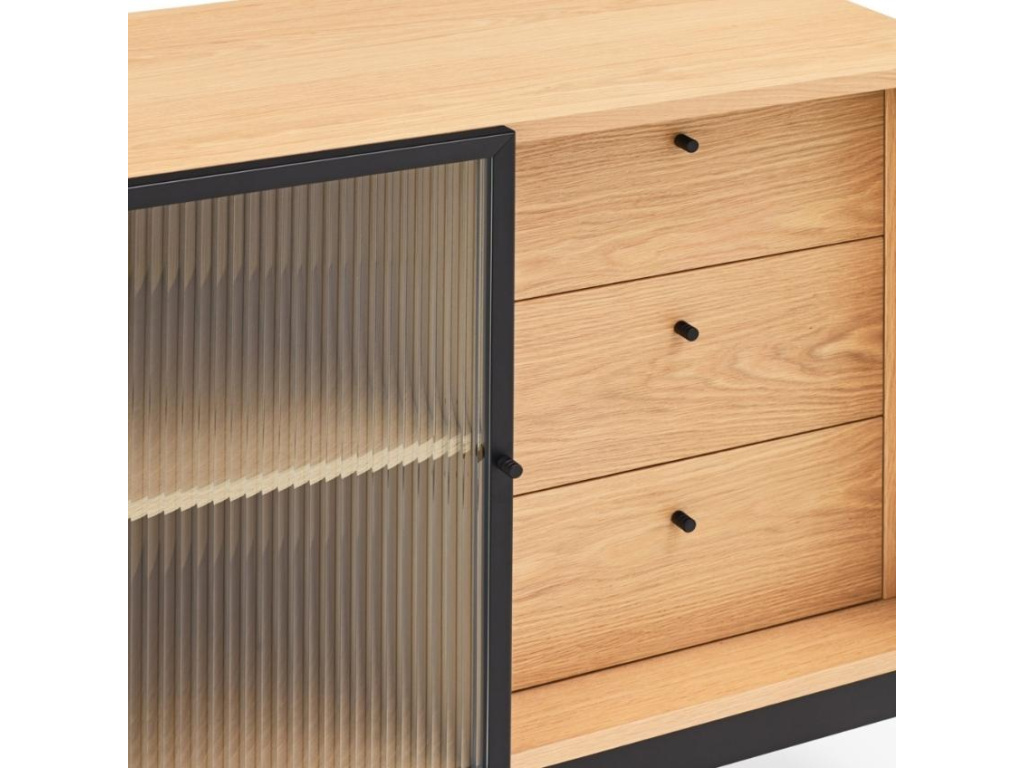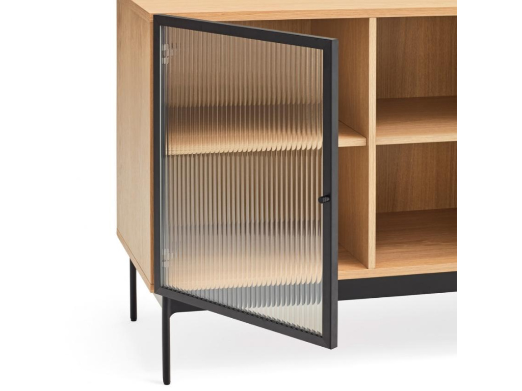 Zajímavá podélná komoda Teulat Blur se rychle stane nepřehlédnutelným designovým prvkem vašeho interiéru. Prostorné police a tři výsuvné zásuvky poskytují dostatečné úložiště pro váš inventář. Osobní kouzlo Teulat Blur spočívá především v prosklených vroubkovaných dvířkách, které komodě dodají na jejím výrazu a osobitosti. Korpus komody je z přírodní dubové dýhy a podnož z černě lakovaného kovu. Komoda se hodí do všech moderně i klasicky zařízených interiérů.