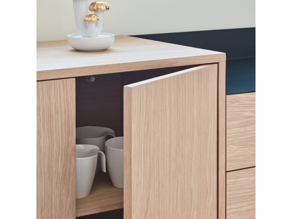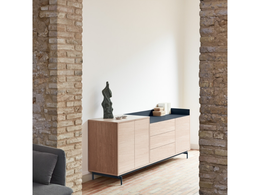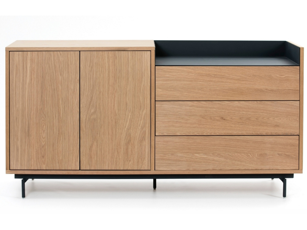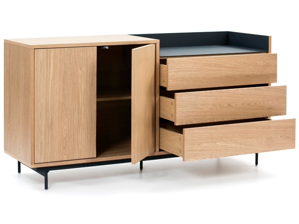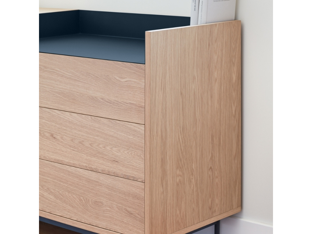 Stylová komoda Teulat Valley zaujme svým neobyčejným designem na první pohled. Korpus z dubové dýhy a lakovaná kovová podnož vytváří atraktivní spojení, díky kterému vnese tato komoda do vašeho interiéru útulnou atmosféru. Komoda Valley disponuje 2 uzavřenými policemi a 3 zásuvkami, díky čemuž získáte dostatek úložného prostoru pro váš inventář. Dekorativní prvek ve formě vyříznutí v tmavě modrém dekoru dodává komodě jedinečnost a osobitost. Komoda Valley se skvěle hodí nejen do moderních interiérů. Dolaďte svůj interiér s celou kolekcí Teulat Valley.
