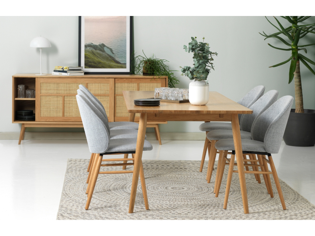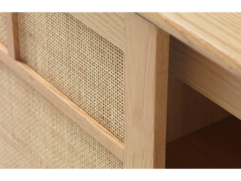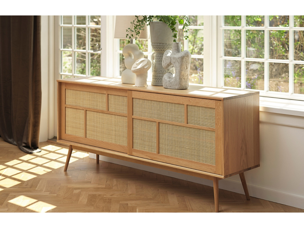 Dubová komoda Barrali od značky Unique Furniture nabízí praktický úložný prostor v podobě 4 polic a jedné zásuvky, to vše schované za posuvnými dvířky. Díky kombinaci dubové dýhy a ratanu přenese kousek přírody i do vašeho domova. Vysoká podnož nejen že dodává produktu na eleganci, ale skvěle se hodí pro domácnosti s robotickým vysavačem. Pokud hledáte stylovou a praktickou komodu, s komodou Barrali určitě neuděláte chybu.