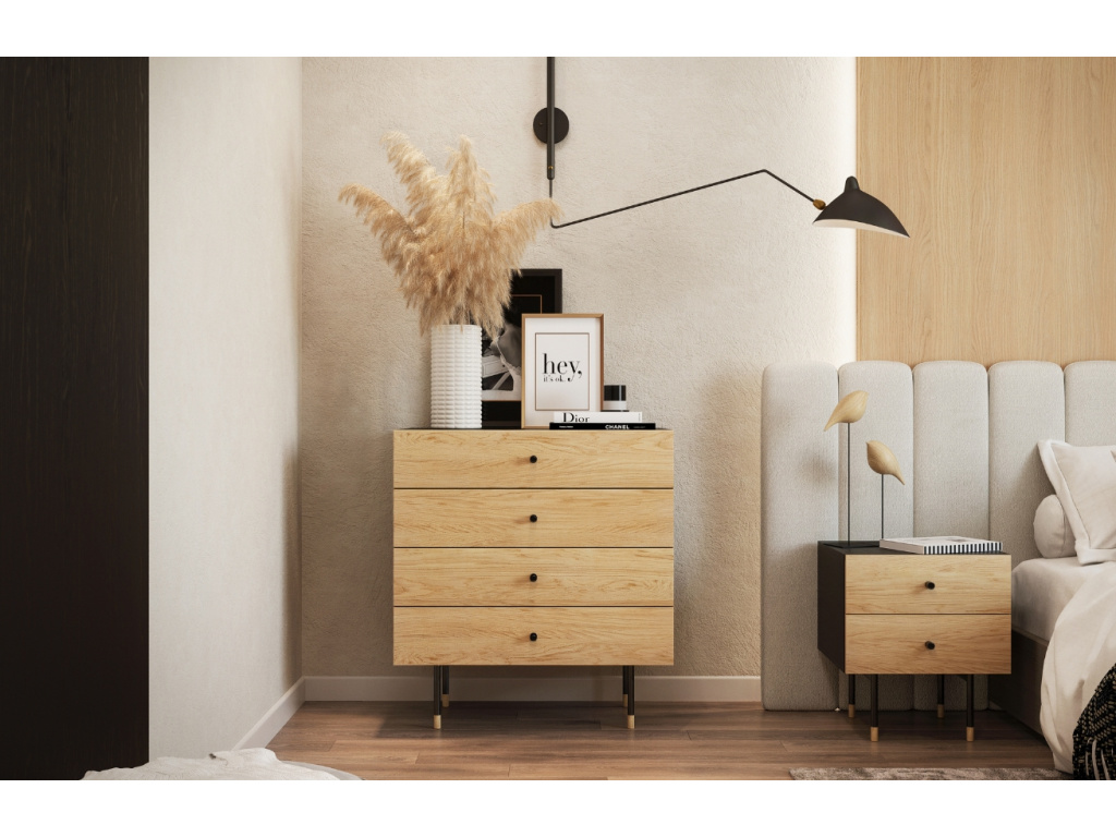 Komoda Jugend přinese do interiéru úložný prostor v podobě 4 zásuvek. Elegantní linie tohoto stylového kousku Woodman Jugend budou vaší ložnici, chodbě i předsíni rozhodně slušet! Kombinace přírodně zbarvené a černé dubové dýhy s kovovou podnoží z masivním dubovým zakončením je vkusná a nadčasová a hodí se do rustikálních, minimalistických i scandi prostor. Využijte vrchní desku komody k vystavení květin, rámečků s fotografiemi i nejhrůznějších drobných dekorací.