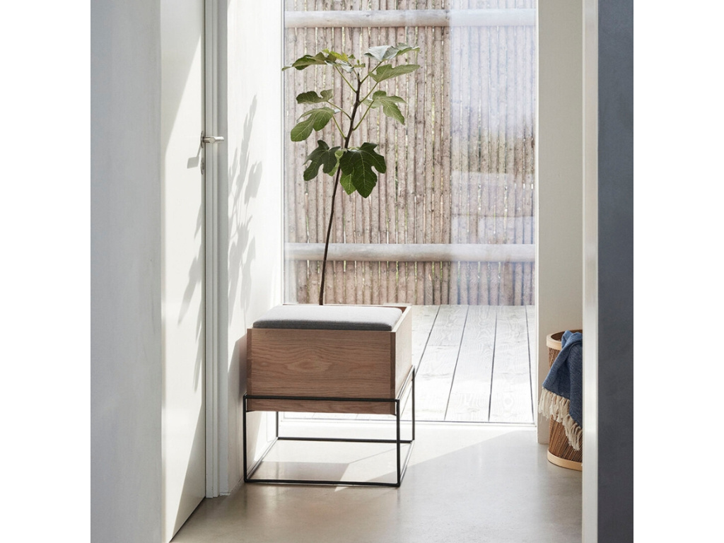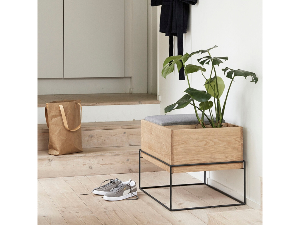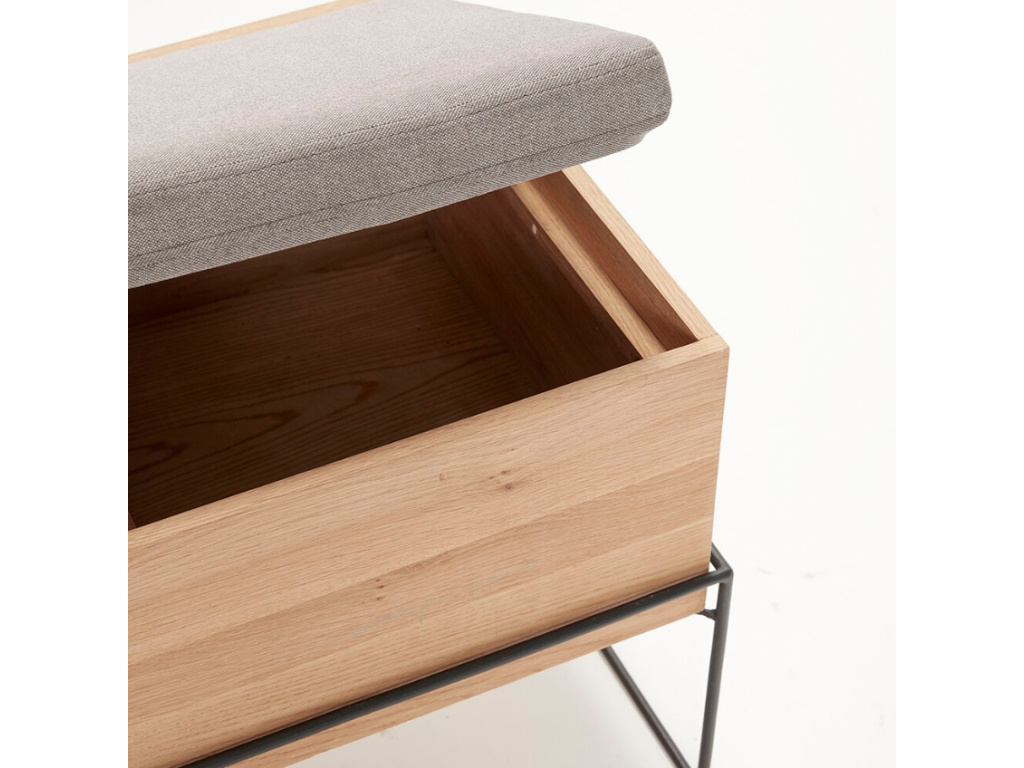 Minimalistickou lavici Collect navrhla dánská značka Hübsch. Její podnož z lakovaného kovu je doplněna o konstrukci z dubové dýhy, kterou doplňuje pohodlný polštář potažený textilií v šedé barvě. Lavice disponuje úložným prostorem pod sedacím polštářem, kam pohodlně uložíte oblečení nebo obuv. Vedle sedáku je další praktický prostor, který lze využít na drobnosti nebo květináč. Lavice Collect bude ideálním společníkem ve vstupních halách, šatnách nebo zimních zahradách.