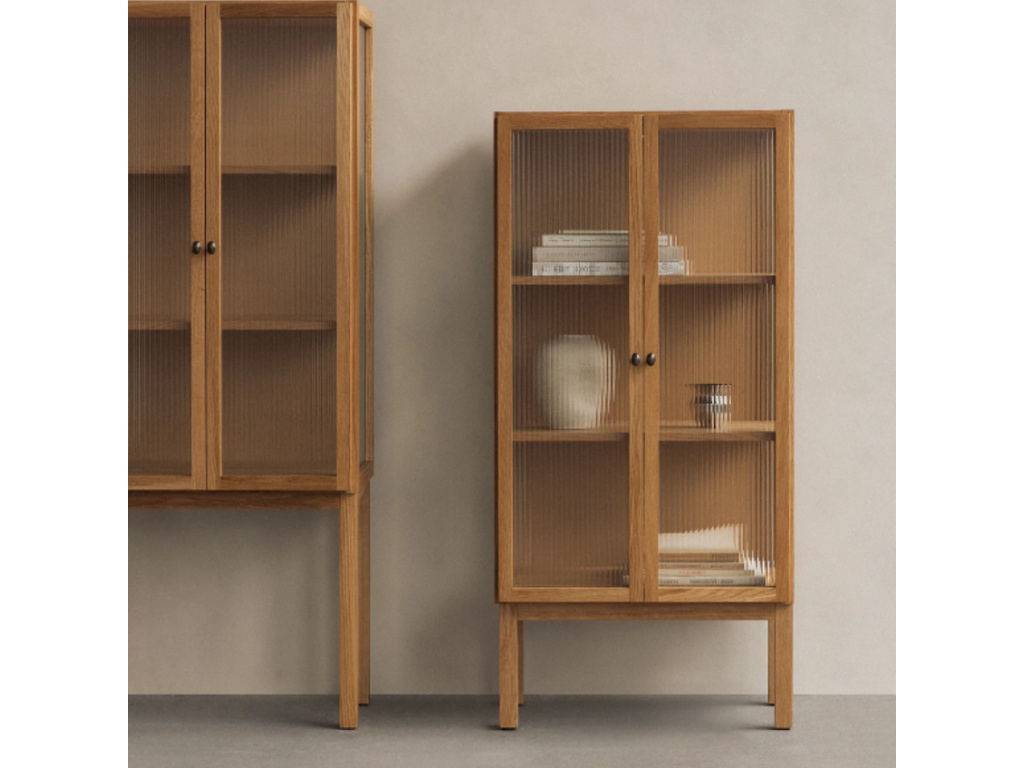 Obohaťte svoji domácnost prosklenou vitrínou CURIOSITY od značky AUDO. Krásná a moderní vitrína je vyrobena z masivního dubového dřeva. Prosklená dvířka skrývají dvě výškově nastavitelné police pro cokoliv, co nechcete mít na očích – sklo totiž jemně rozmazává pohled dovnitř vitríny. Jistě zaujmou i měděné detaily, jako panty a madla dvířek. Vitrína bude perfektní v kuchyni pro úschovu vzácného a svátečního nádobí, využití pro ni najdete ale také v pracovně nebo v obývacím pokoji. V nabídce máme také variantu s vysokou podnoží, která je o 25 cm vyšší.