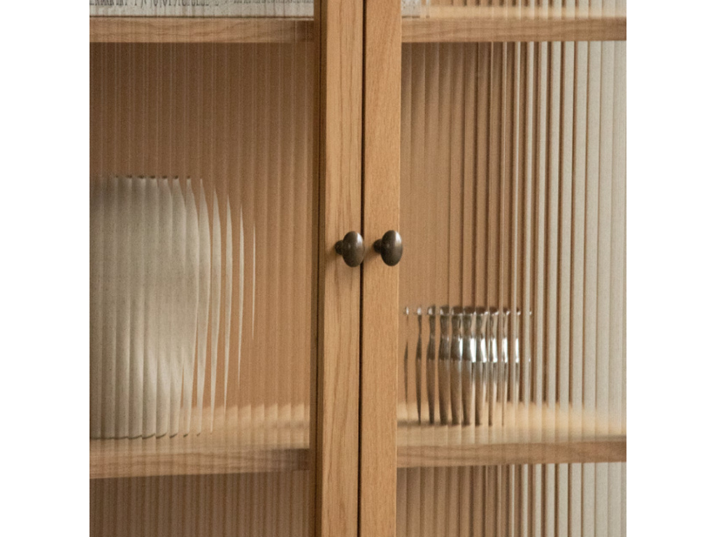 Obohaťte svoji domácnost prosklenou vitrínou CURIOSITY od značky AUDO. Krásná a moderní vitrína je vyrobena z masivního dubového dřeva. Prosklená dvířka skrývají dvě výškově nastavitelné police pro cokoliv, co nechcete mít na očích – sklo totiž jemně rozmazává pohled dovnitř vitríny. Jistě zaujmou i měděné detaily, jako panty a madla dvířek. Vitrína bude perfektní v kuchyni pro úschovu vzácného a svátečního nádobí, využití pro ni najdete ale také v pracovně nebo v obývacím pokoji. V nabídce máme také variantu s nízkou podnoží, která je o 25 cm nižší.