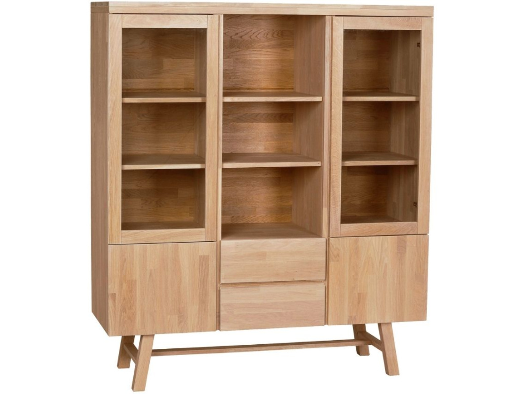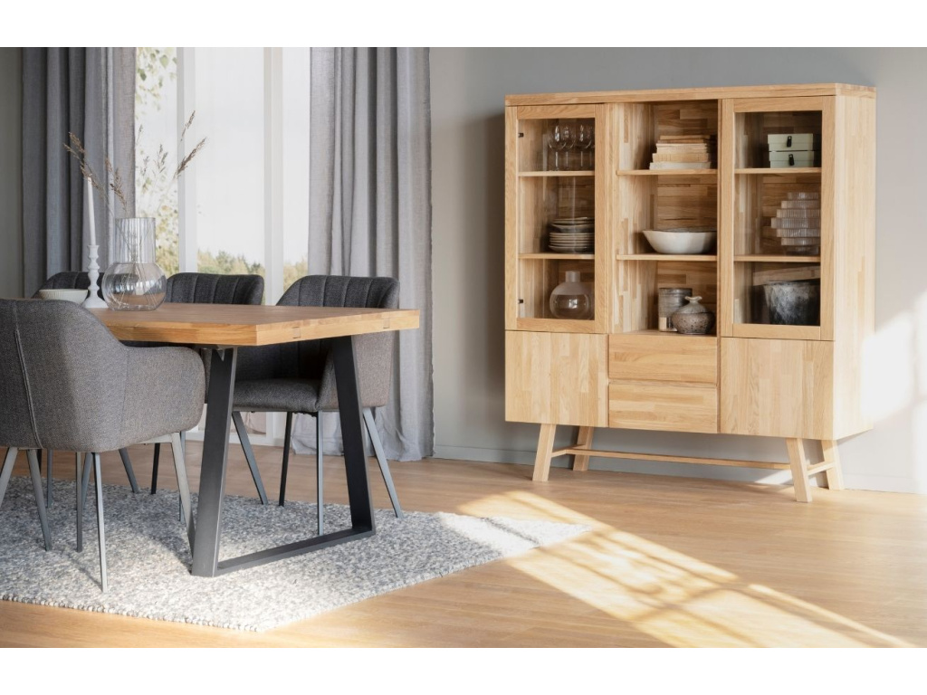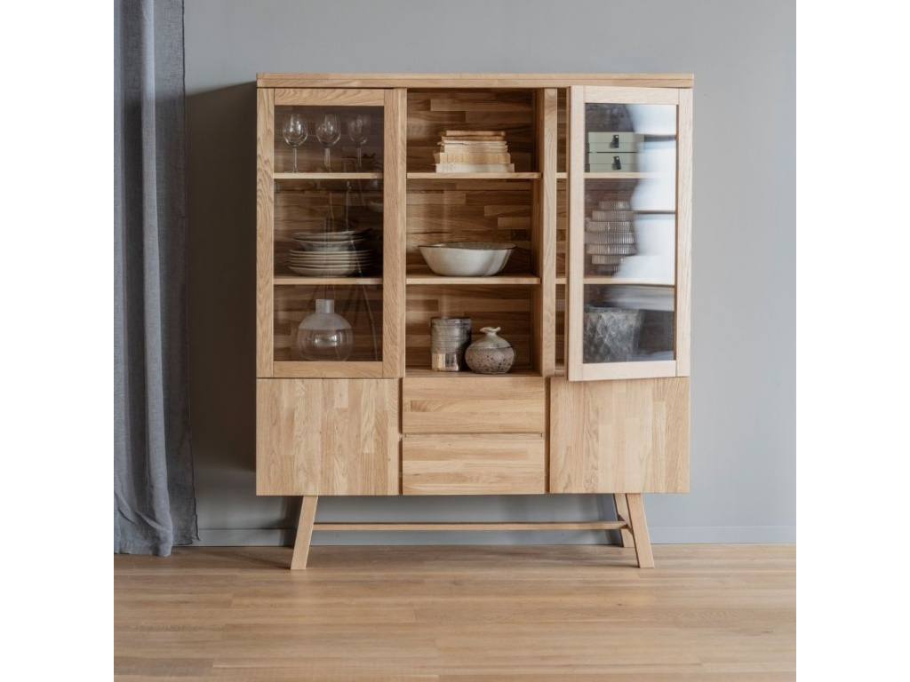 Robustní vitrína ROWICO BROOKLYN z dubového dřeva působí díky vyšší podnoži vzdušně a stane se výrazným prvkem interiéru. Nabízí dostatek úložného prostoru na vystavení dekorací a porcelánu, nebo třeba trofejí a vlastních kreativních výtvorů. Dvoje prosklené dveře za sebou ukrývají tři police, další tři police jsou otevřené a za dvěma menšími dvířky je další police. Pod otevřenými policemi najdete dvě praktické zásuvky, které se stejně jako dvířka zavírají pomocí systému soft close. Vitrína se skvěle hodí především do obývacího pokoje nebo jídelny.