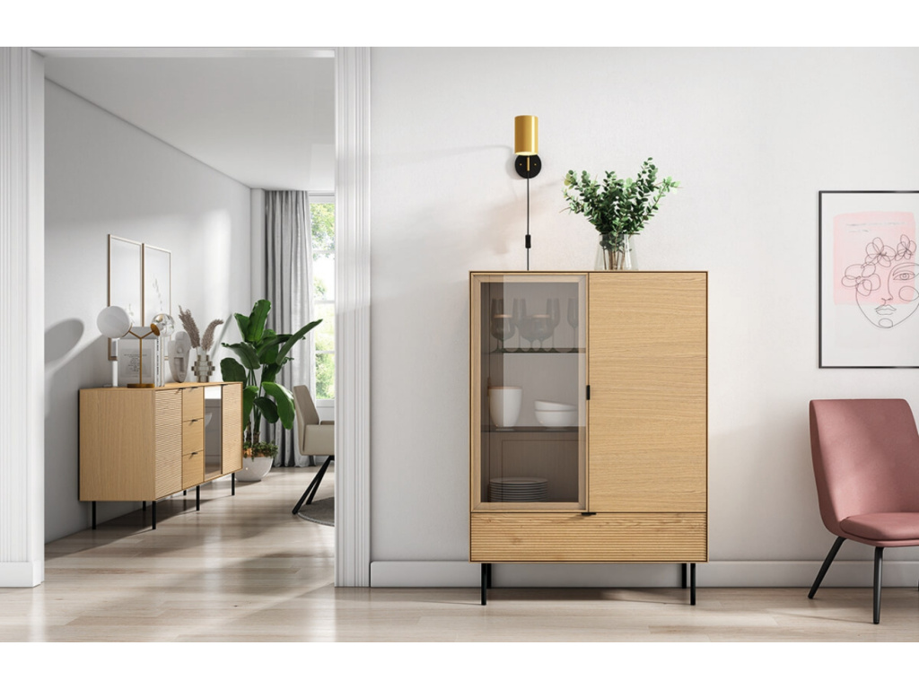 Dubová vitrína Tulsa od španělské značky Somcasa vnese do vašeho domova nádech skandinávského stylu. Vitrína se pyšní minimalistickým funkčním designem, který představuje nesmrtelnou kombinaci dřeva, skla a kovu. Korpus je vyroben z dubové dýhy a doplňují ho skleněná dvířka s měkkým zavíracím systémem Soft closing. Vespod vitríny najdete praktickou zásuvku z masivního dřeva s povrchovým dekorem. Tu využijete například na potřebný inventář, který zrovna nechcete mít na očích. Stabilitu vitríny zajišťuje lakovaná kovová podnož, jež působí lehkým vzdušným dojmem. Kombinace přírodního dřeva a černého kovu působí elegantně a vnese do prostoru svěží nádech. Vitrína se bude skvěle vyjímat v kuchyni, jídelně i obývacím pokoji a spolu s doplňky ze stejnojmenné kolekce bude vytvářet dokonalý soulad.