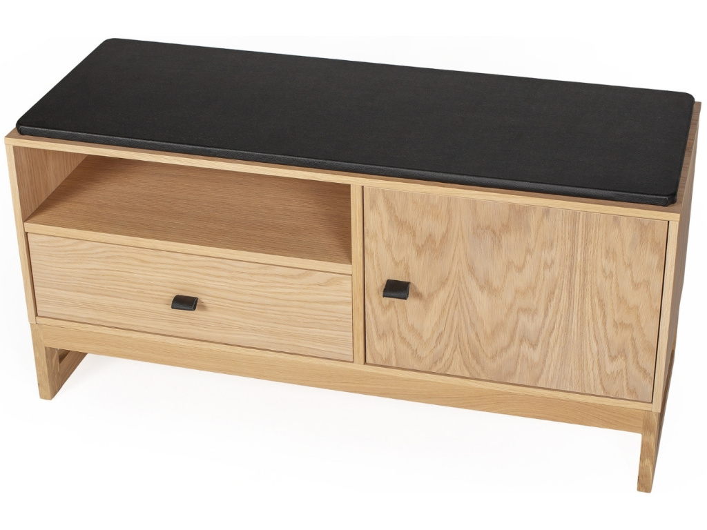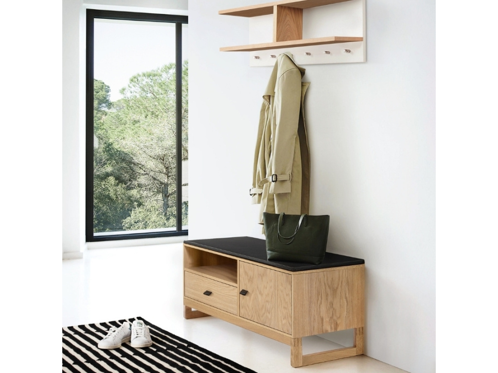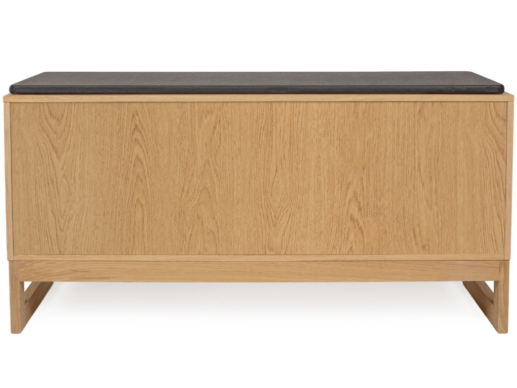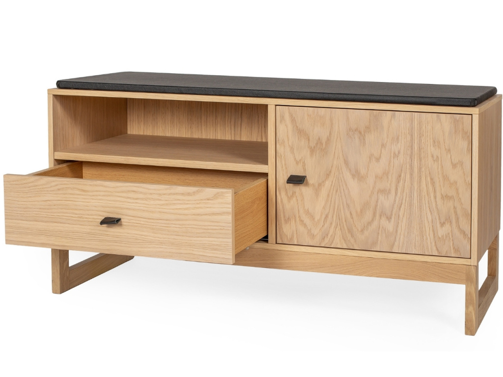 Moderní a praktický botník Woodman Slussen se rychle stane oblíbeným a praktickým společníkem ve vaší předsíni. Úložný prostor pojme minimálně 8 párů bot a je prakticky rozčleněn na dvě police s dvířky a jednu otevřenou. Celý botník je z dubové dýhy a doplněn odolnou podnoží z dubového dřeva. K pohodlnému nazouvání a zouvání můžete využít horní část botníku, která zastává funkci lavice s atraktivním koženým čalouněním.