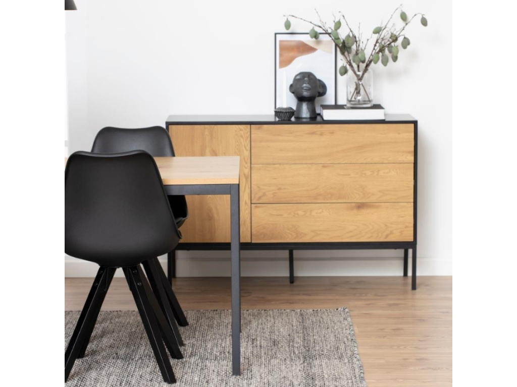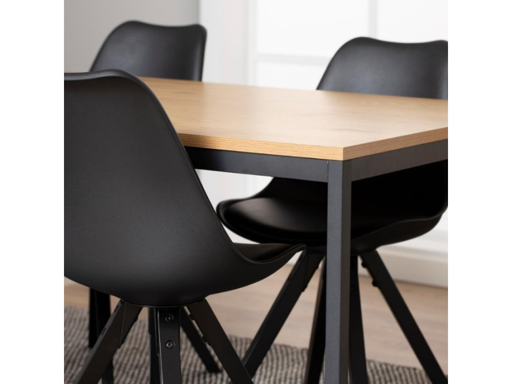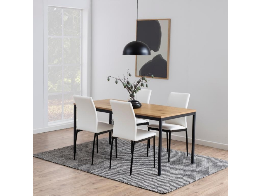 Jídelní stůl Darila byl vyroben v minimalistickém stylu. Laminátová deska s dekorem dubu v kombinaci s černě lakovanou kovovou podnoží vytváří atraktivní kontrast, který zaujme. Deska stolu je prostorná, a proto se jedná o ideální volbu, pokud rádi trávíte čas s rodinou. Díky svému jednoduchému designu se hodí do všech interiérů.