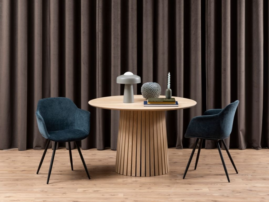Pro svůj unikátní vzhled se jídelní stůl Eustace stane středobodem vašeho interiéru, u kterého bude radost se setkávat s rodinou. Deska má kulatý tvar, krásnou dřevěnou kresbu a je doplněna kónickou podnoží z dubové dýhy. Stůl Eustace lze doplnit dřevěnými, čalouněnými i kovovými židlemi.