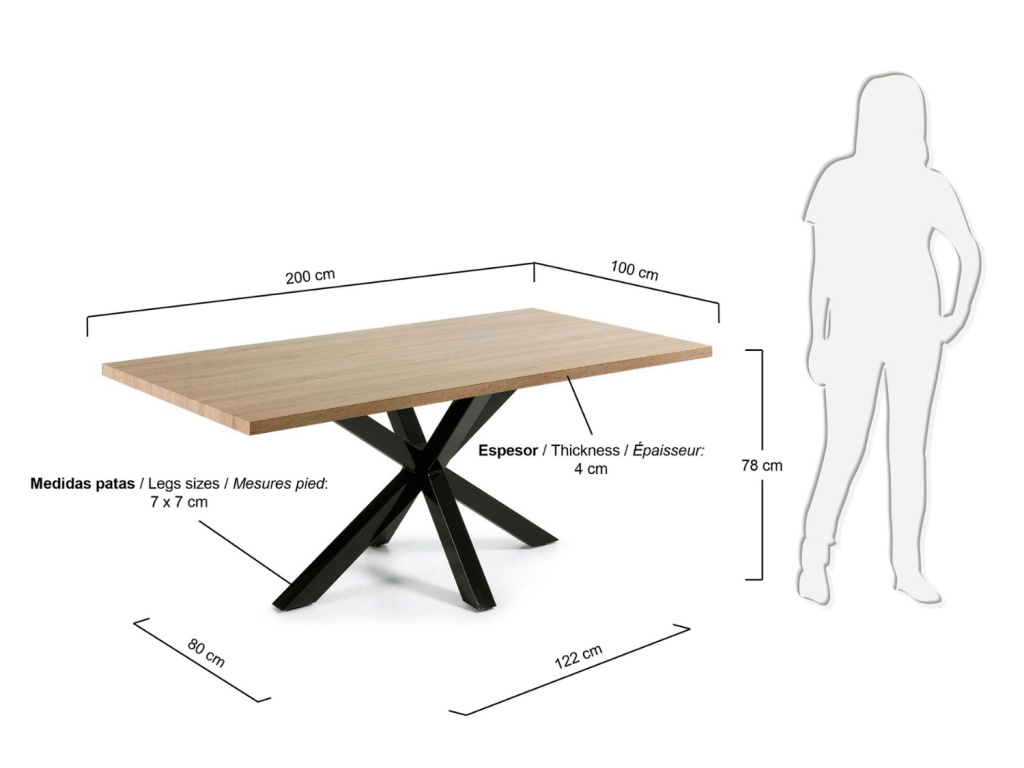 Krásný a nadčasový jídelní stůl Kave Home Argo vás na první pohled zaujme svým originálním a propracovaným designem. Podnož zajišťující perfektní stabilitu je vyrobena z černě lakované oceli a má zajímavý tvar připomínající hvězdu. Desku tvoří lakované MDF v přírodním odstínu a skvěle se s podnoží doplňuje. Tento jídelní stůl je díky svým rozměrům skvělou volbou zejména pro početnější rodiny.