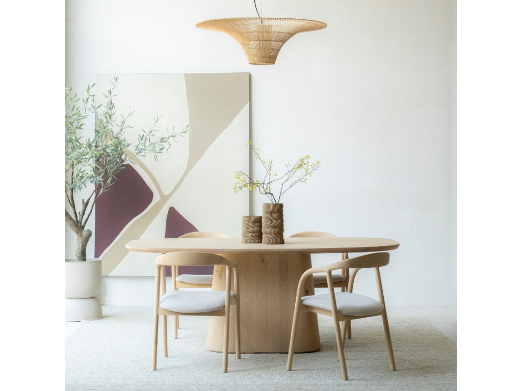 Nechte se unést organickými tvary designového jídelního stolu Nola od značky Eleonora, který vás okouzlí svými křivkami, ale i kvalitním materiálem. Stoly jsou vyrobeny z dubové dýhy v přírodním odstínu, díky čemuž perfektně zapadnou do klasických i rustikálně laděných interiérů. Dřevěná podnož se skládá z jednotlivých pruhů dřeva, což stolu dodává jeho unikátní vzhled. Pozvěte přátele nebo uspořádejte rodinnou večeři a užijte si společné chvíle u této jedinečné designovky!
