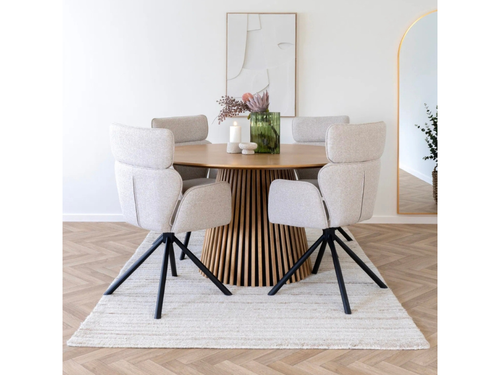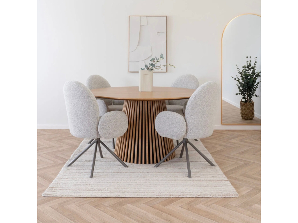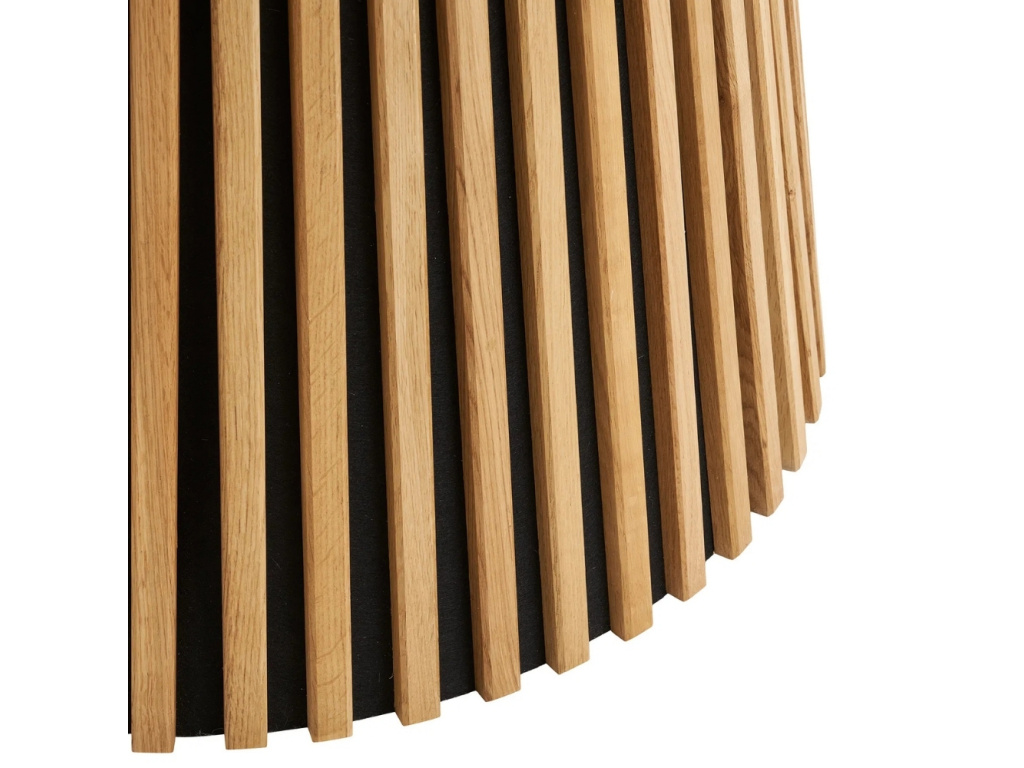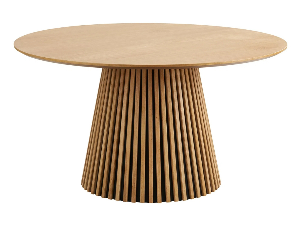 Jídelní stůl Osaka přináší do každého interiéru dokonalé spojení elegance, originality a přírodních materiálů. Jeho kulatá deska z kvalitní dubové dýhy vytváří přívětivou atmosféru, která vybízí k posezení a společnému stolování. Dominantní podnož tvořená vertikálními lamelami nejen zaujme na první pohled, ale zároveň dodává stolu výrazný designový charakter. Tento stůl snadno zaujme i náročného milovníka moderního nábytku, protože spojuje funkčnost s estetikou. Skvěle se hodí do skandinávského, japandi nebo moderního minimalistického stylu, kde vynikne jeho čistý design a přírodní materiál.