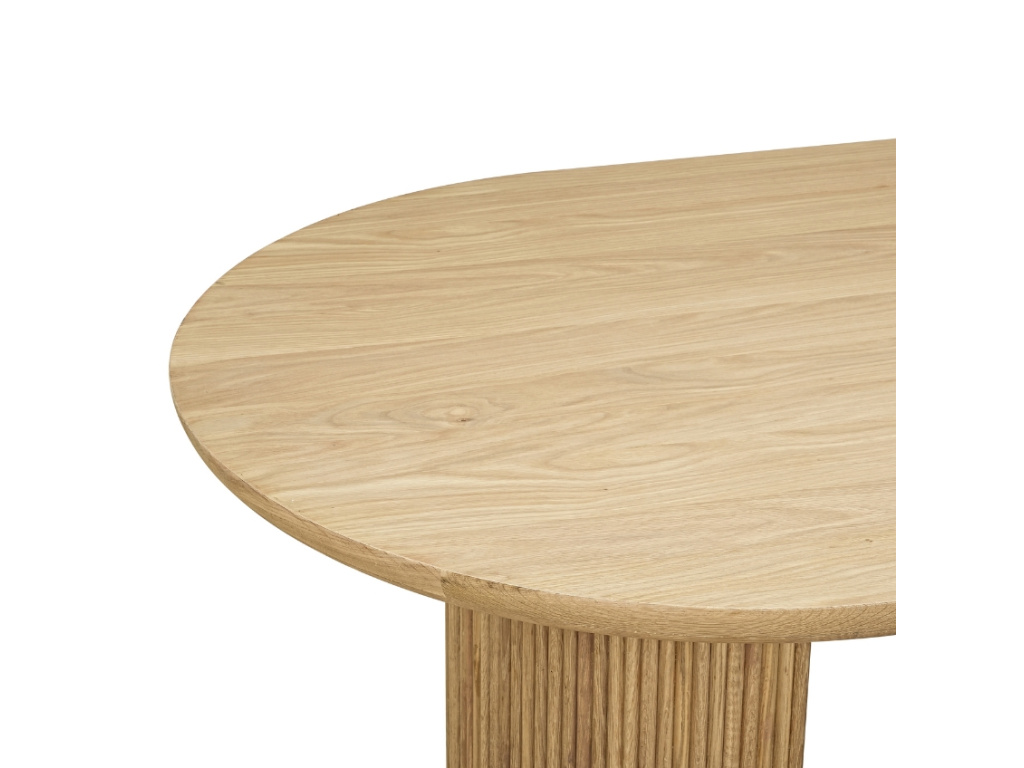 Jídelní stůl Belfort z masivní dubové dýhy v přírodním odstínu kombinuje robustnost s nadčasovým stylem. Jeho oválná deska působí elegantně a prostorně a široká půlkruhová podnož s lamelovou texturou dodává stolku a stabilitu a bytelnost. Tento stůl je ideální volbou pro milovníky přírodních materiálů a moderního designu, kteří hledají krásu v jednoduchosti. Belfort je dispozici ve dvou velikostech, takže si můžete vybrat variantu, která přesně padne do vašeho prostoru. S tímto stolem se rodinná setkání nebo večírky s přáteli stanou ještě výjimečnějšími.