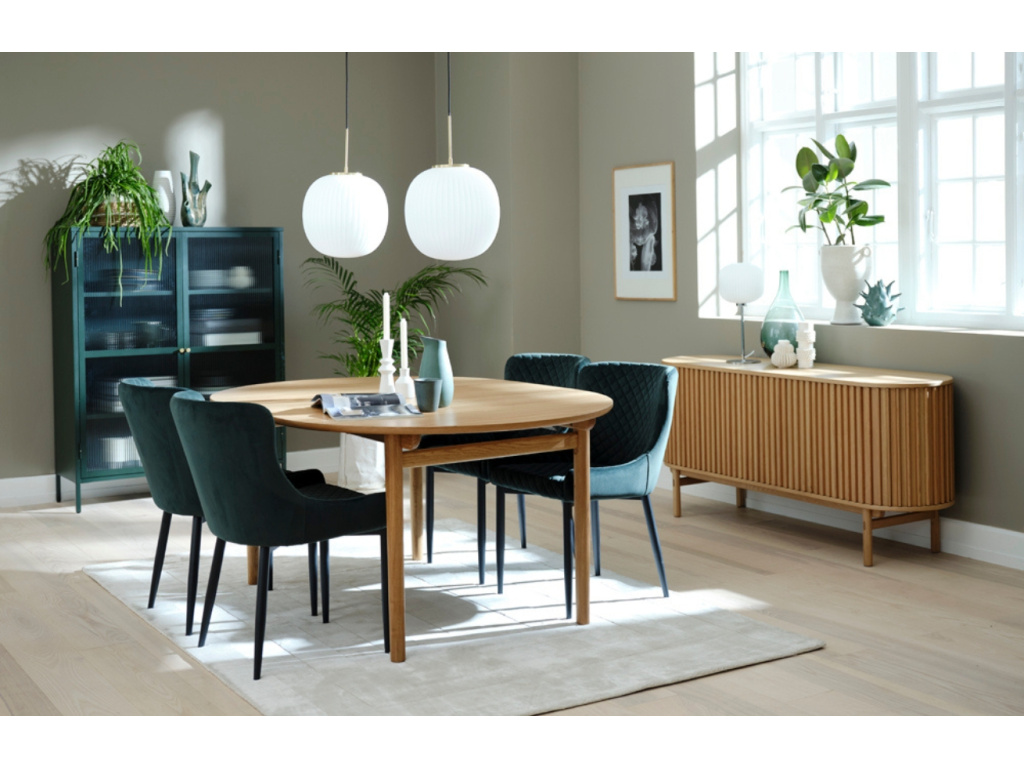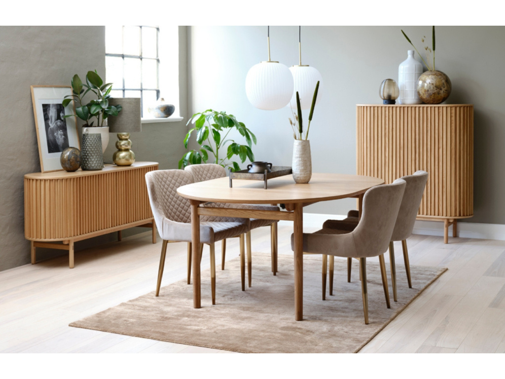 Oválný jídelní stůl Carno od značky Unique Furniture zaujme svým jednoduchým čistým designem a okamžitě se stane dominantou vaší jídelny. Jeho desku tvoří dubová dýha a podnož je vyrobená z masivního dubového dřeva stejné barvy. Hodí se do menších bytů i prostorných jídelen v nádechu skandinávského stylu. Pohostěte svoje nejbližší u jídelního stolu Carno, který nabízí místo k sezení pro šest osob.