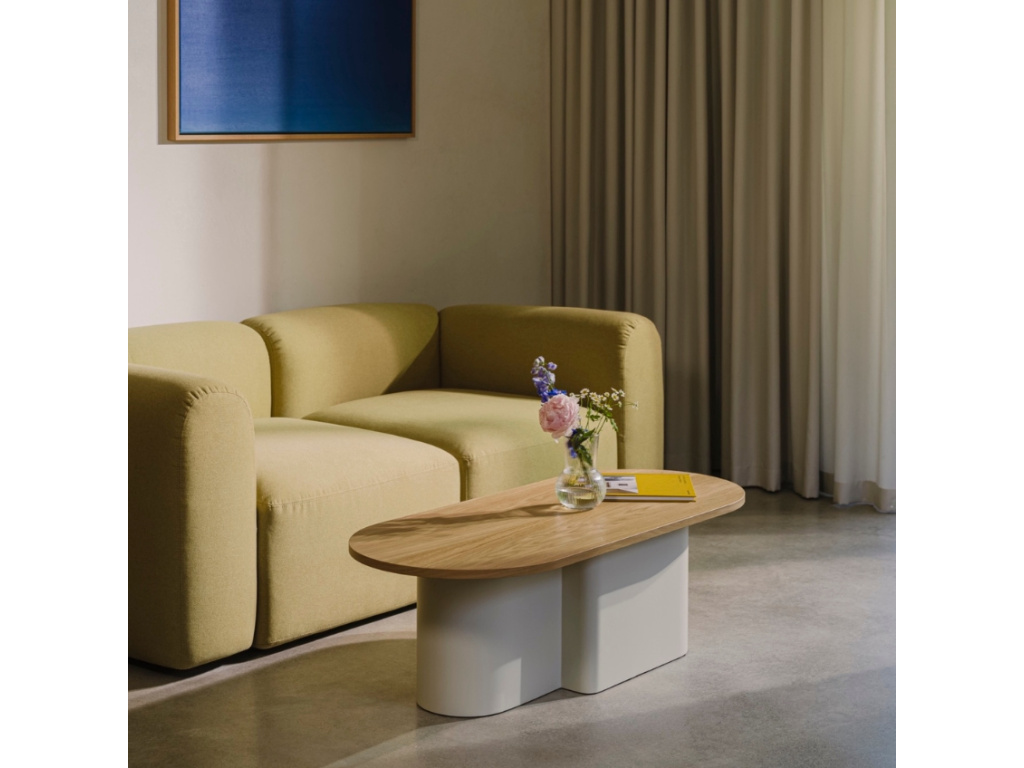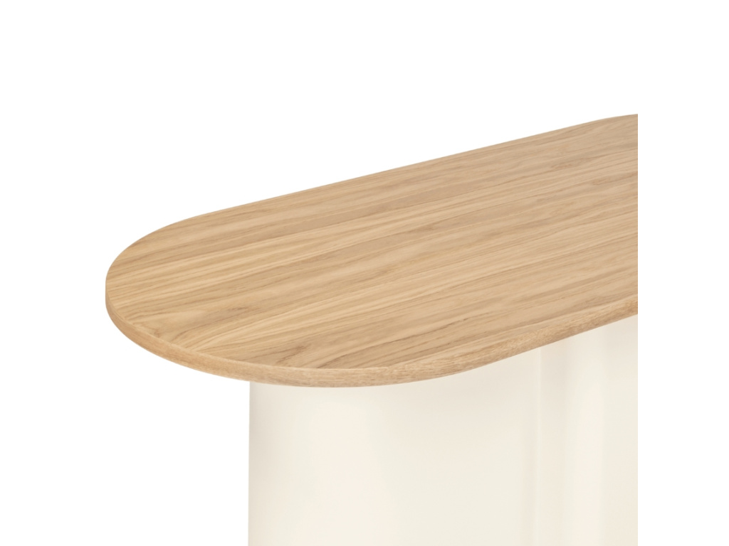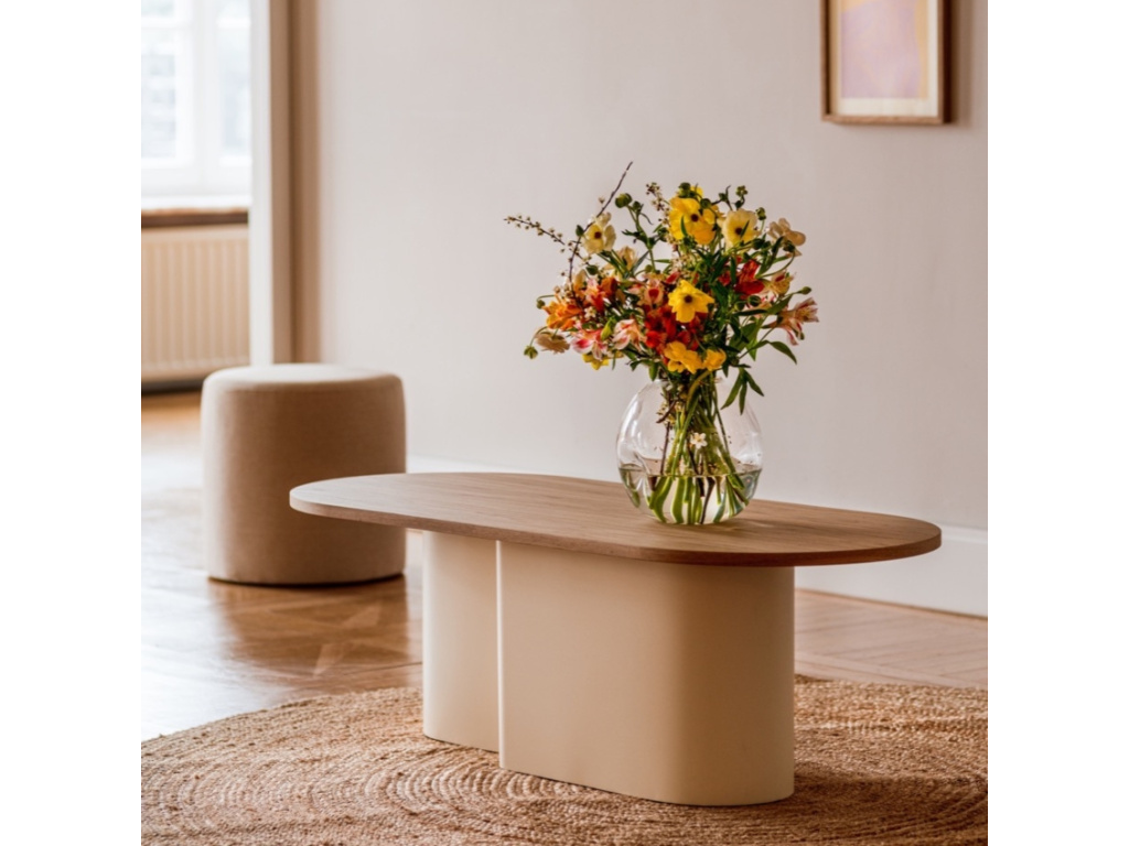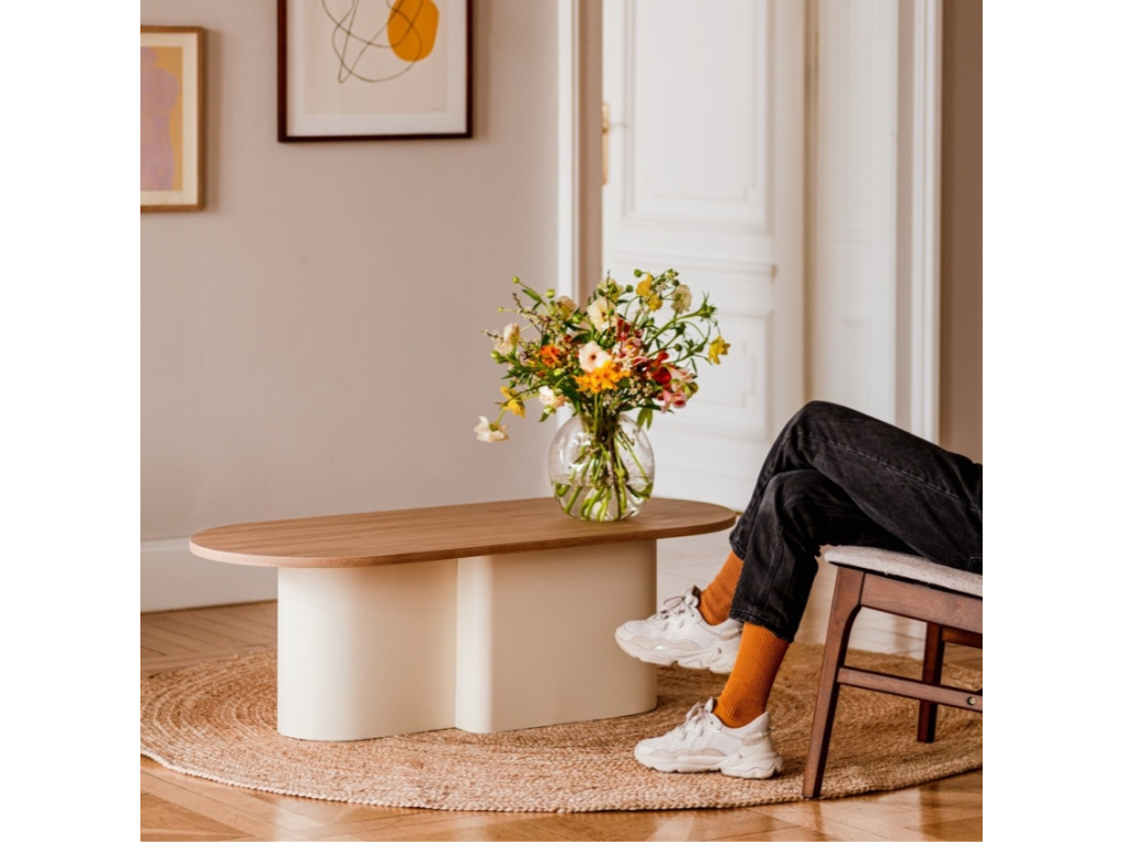 Oválný konferenční stolek Looi je představitelem minimalismu a moderního designu. Stolek bude ideální volbou pro všechny, kteří hledají jedinečný a funkční doplněk do svého interiéru. Odolná konstrukce z oceli a deska z dubové dýhy, to je kombinace, která skvěle padne do malých moderních prostor a osvěží tak design vašich obývacích pokojů.