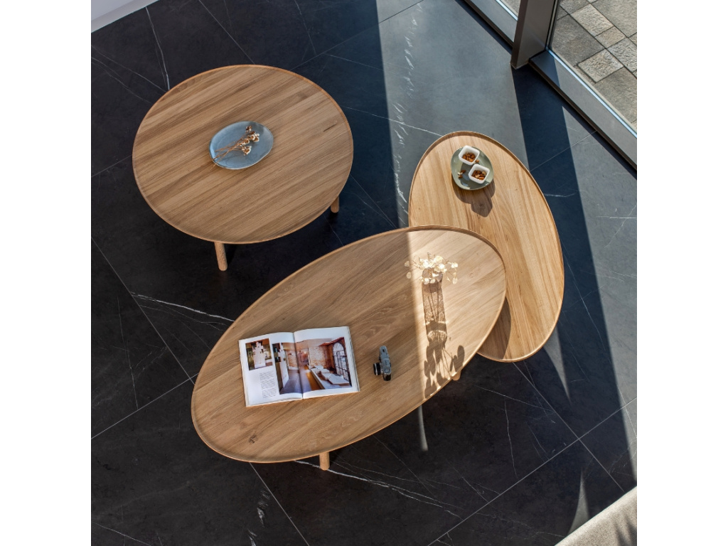 Masivní konferenční stolek Mu je dostupný ve třech velikostech, které můžete stylově kombinovat – díky odlišným výškám se dají zasunout pod sebe a vytvořit tak zajímavě uspořádaný odkládací prostor. A když vás současné rozložení začne nudit? Prostě ho změňte! Stolky jsou vyrobeny z naolejovaného dubového dřeva a jejich desky disponují lehce vyvýšeným okrajem, což představuje zajímavý detail. Díky vyvážené všestrannosti a jednoduchosti společně s atraktivním materiálem se stanou středobodem obývacího pokoje. A pokud máte radši tmavší interiéry, můžete mít stolky Mu také v tmavém dubovém provedení.