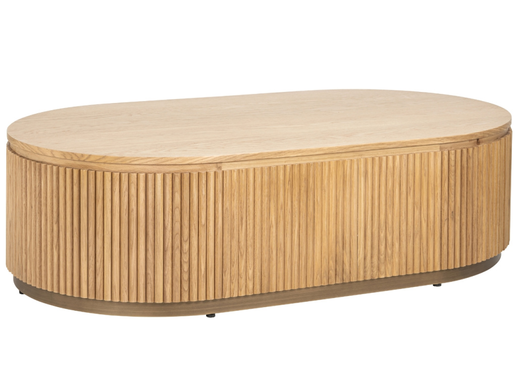 Konferenční stolek Belfort z dubových lamel zaručeně vynikne ve vašem obývacím pokoji a stane se jeho chloubou. Dřevo je vkusně doplněno o kovovou zlatou podnož, která rustikálnímu stolku dodá nádech elegance. Dopřejte vašemu interiéru hřejivou atmosféru s novým designovým kouskem. V sérii Belfort od značky Richmond najdete další stylový nábytek, který stolek skvěle doplní.