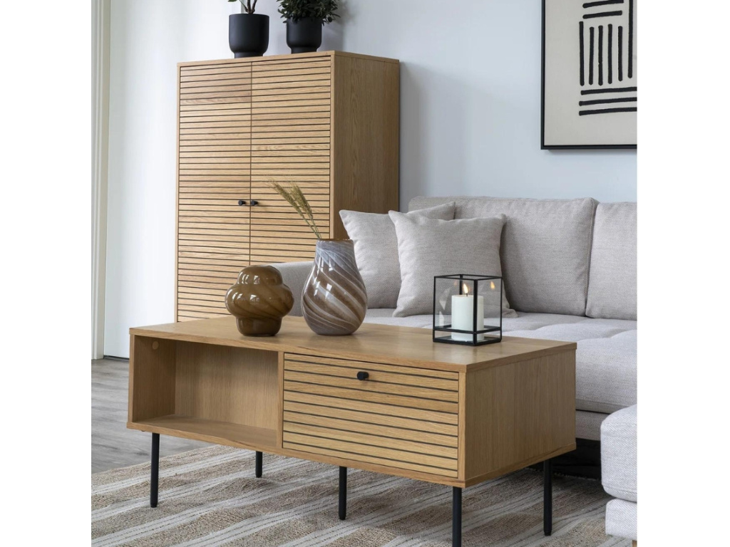 Konferenční stolek Serenity je skvělou volbou do rustikálních interiérů s nádechem retra. Přírodní odstín dubové dýhy zútulní váš domov a dodá mu hřejivý dojem. Minimalistický tvar a stylové žebrování dělají ze stolku jedinečný designový kousek. Jistě oceníte jeho úložné prostory tvořené dvěma otevřenými policemi a dvěma protilehlými zásuvkami na uložení vašich osobních drobností. Díky vyšší podnoži je navíc vhodný i do domácností s robotickým vysavačem. Pro dokonalé doladění prostoru doporučujeme stolek kombinovat s dalšími produkty řady Serenity.