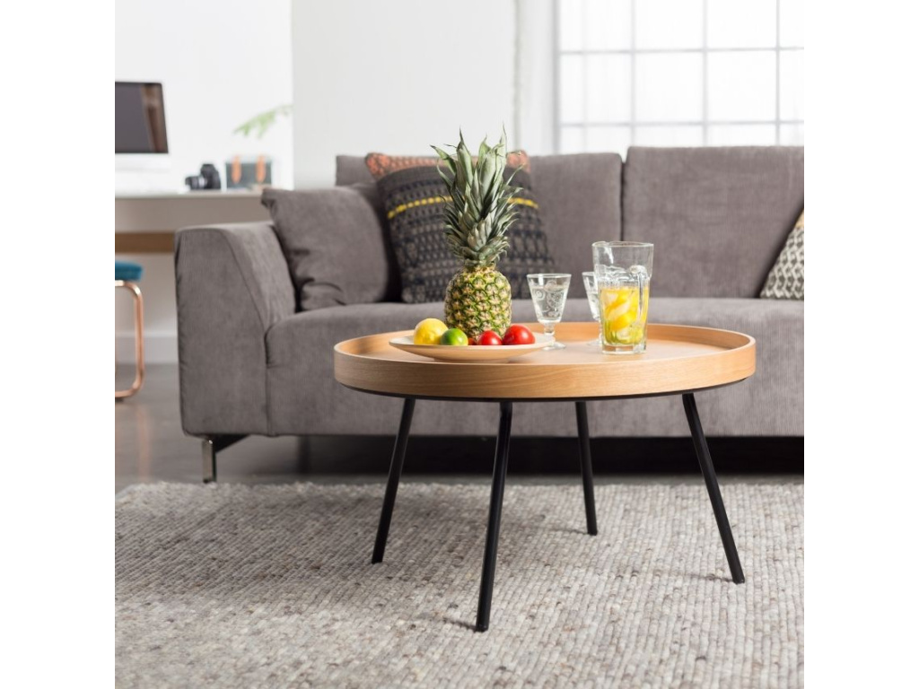 Elegantní konferenční stolek ZUIVER OAK TRAY s odnímatelnou deskou vyrobenou z kvalitních dřevovláknitých desek pokrytých slabým plátem z dubové dýhy. Velice důležitým prvkem tohoto stolku je okraj z překližky v přírodní barvě. Stabilitu, a především perfektní a elegantní synchronizaci s deskou stolu zajišťuje ocelová podnož lakovaná matně černou barvou.