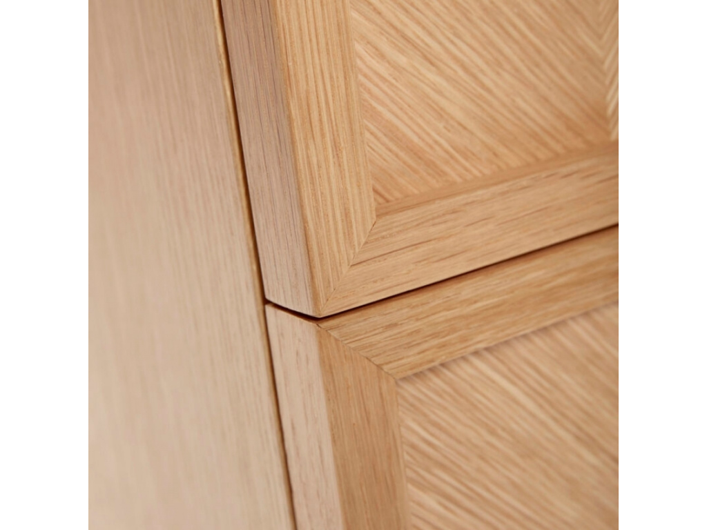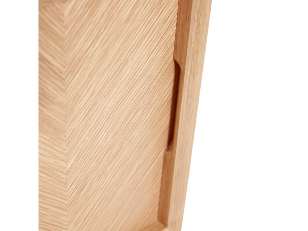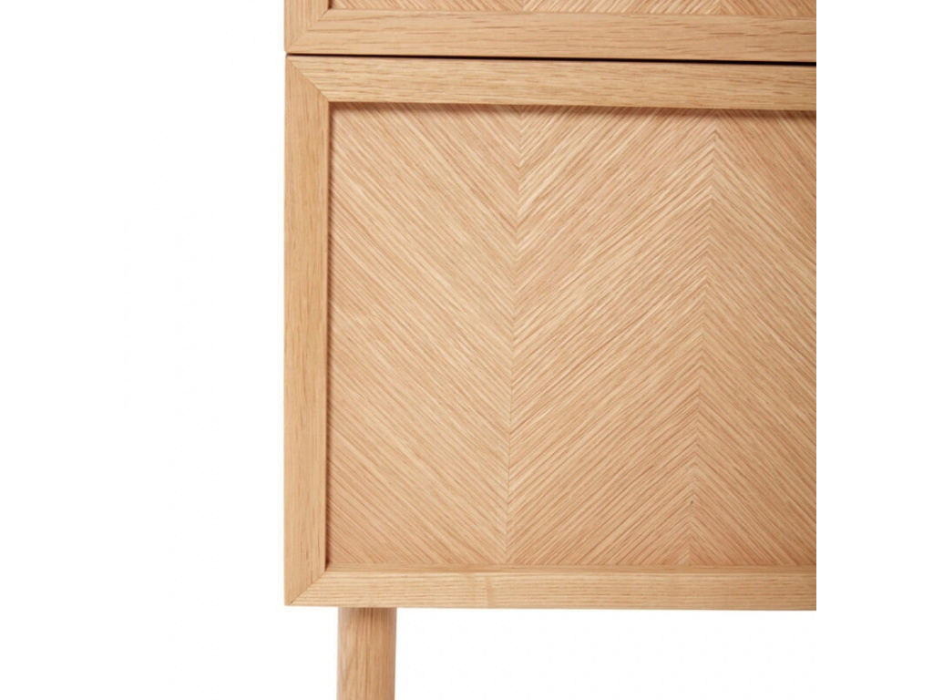 Dřevěný noční stolek Hübsch Herringbone zaujme svým nadčasovým designem. Celý stolek je vyroben z dubového dřeva, bez dalších barevných nátěrů, a tak krásně vyniká jeho přírodní struktura. Stolek nabízí dvě zásuvky se zdobenými dvířky. Dekor na dvířkách je vyroben z geometricky poskládaného dřeva, čímž podtrhován jedinečný vzhled stolku. Stolek Hübsch Herringbone se skvěle se hodí do moderně laděného interiéru s nádechem skandinávského stylu.