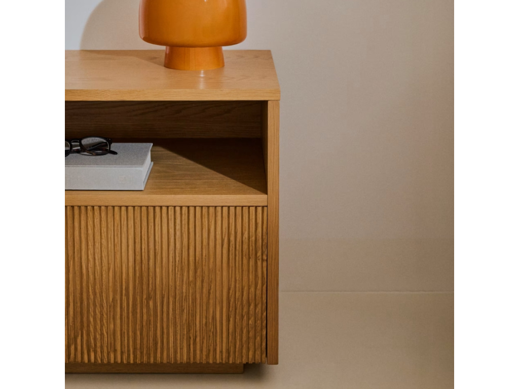 Úložné prostory ve vašem interiéru můžete vyřešit se stylovou sérií nábytku Kave Home Helvine. Kromě vitríny v ní najdete také komody několika velikostí i noční a televizní stolek. Všechny tyto kousky jsou vyrobeny z dubové dýhy pyšnící se FSC certifikací – můžete si tedy být jistí, že pochází z modelu odpovědného lesního hospodářství. Prostorný noční stolek přinese do interiéru úložný prostor v podobě jedné zásuvky a jedné otevřené police – získáte tak vedle své postele prostor pro odložení časopisů a knížek, léků, brýlí na čtení a dalších drobností a cenností, které chcete mít při ruce.
