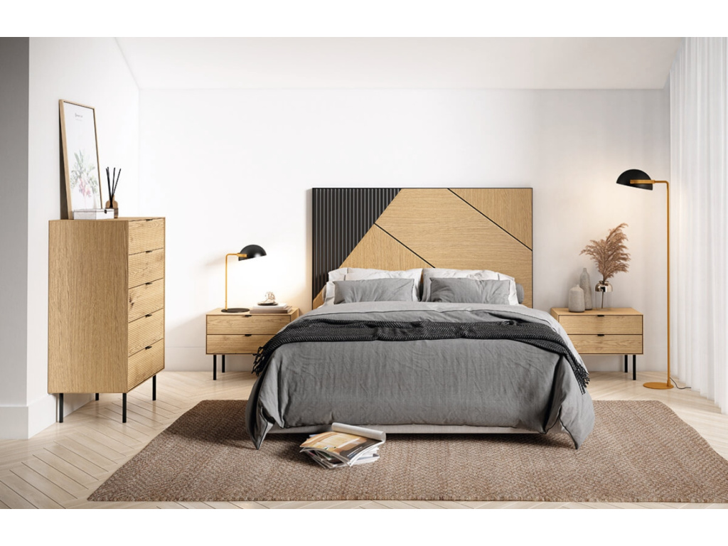 Noční stolek od španělské značky Somcasa je nadčasovou designovkou v sérii nábytku TULSA. Stolek se pyšní minimalistickým a zároveň funkčním designem, který představuje nesmrtelnou kombinaci dřeva a kovu. Korpus je vyroben z dubové dýhy a doplňují ho dvě praktické zásuvky z dubového masivu, které disponují kovovými rukojeťmi a měkkým zavíracím systémem Soft closing. Zásuvky využijete například na své oblíbené knihy a časopisy, které si rádi přečtete před spaním. Stabilitu stolku zajišťuje lakovaná kovová podnož, jež působí lehkým vzdušným dojmem. Kombinace přírodního dřeva a černého kovu působí elegantně a vnese do prostoru svěží nádech. Noční stolek se bude skvěle vyjímat v moderních či skandinávských interiérech a nejlépe vynikne spolu s dalšími doplňky ze stejnojmenné kolekce.