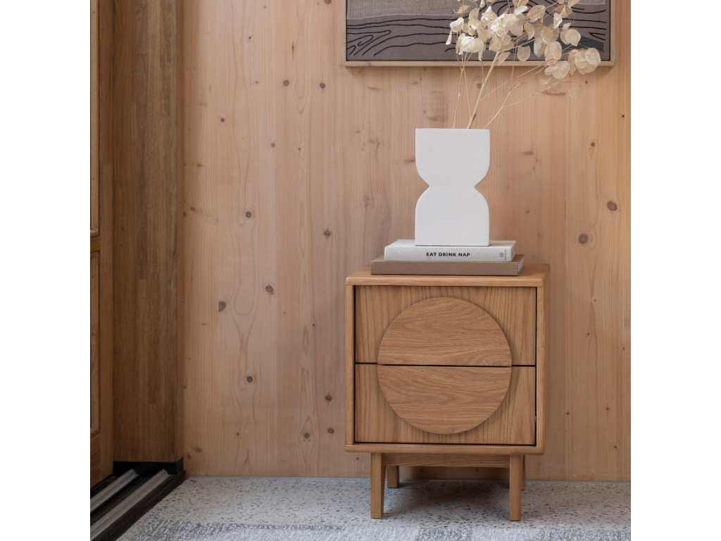 Představujeme vám designový noční stolek GROOVE od značky ZUIVER. Nevšední dekor v podobě reliéfového kruhu na jeho zásuvkách zaujme nejeden pár očí. Půlkruhový prvek doplňuje také vnitřní část podnože, která díky tomu působí lehkým a vzdušným dojmem. Stolek je vyroben z masivního dubového dřeva, které je následkem použitého laku krásně lesklé. Stolek poskytne díky dvěma zásuvkám dostatek úložného prostoru pro váš inventář, který nechcete mít na očích. GROOVE zazáří v moderním i vintage interiéru a nejlépe ve společnosti dalšího nábytku z řady GROOVE – zkompletujete celý set?