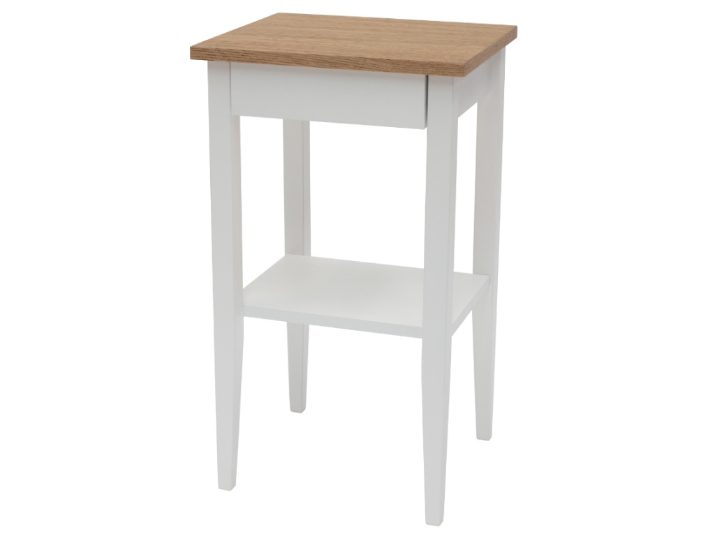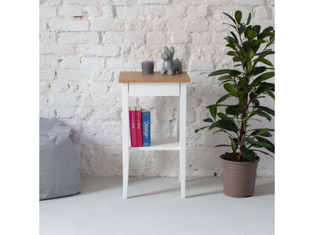 RAGABA ENTLIK je praktickým stolkem do domácnosti v čistém jednoduchém designu. Deska stolku je vyrobena z dubové dýhy a doplňuje ji vysoká podnož z bukového masivu. Výhodou stolku je nenápadná zásuvka, která však poskytne dostatečné úložiště na vaše drobnosti. Zásuvka je opatřena tlumičem, proto se nemusíte bát případných nárazů nebo brzkého opotřebení. Praktickým prvkem je také police, kam můžete umístit oblíbené knihy či dekorace a květiny. Stolek bude skvělým doplňkem do obývacího pokoje i jako noční stolek do ložnice.