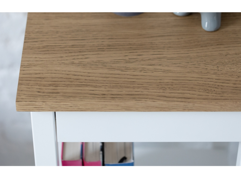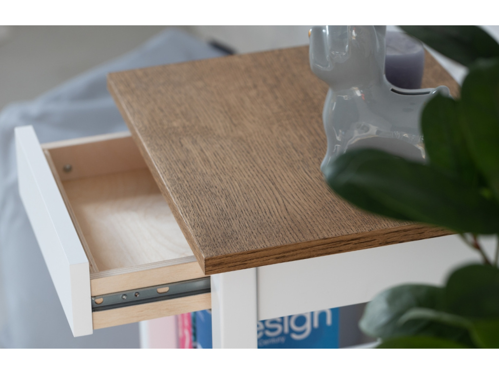 RAGABA ENTLIK je praktickým stolkem do domácnosti v čistém jednoduchém designu. Deska stolku je vyrobena z dubové dýhy a doplňuje ji vysoká podnož z bukového masivu. Výhodou stolku je nenápadná zásuvka, která však poskytne dostatečné úložiště na vaše drobnosti. Zásuvka je opatřena tlumičem, proto se nemusíte bát případných nárazů nebo brzkého opotřebení. Praktickým prvkem je také police, kam můžete umístit oblíbené knihy či dekorace a květiny. Stolek bude skvělým doplňkem do obývacího pokoje i jako noční stolek do ložnice.