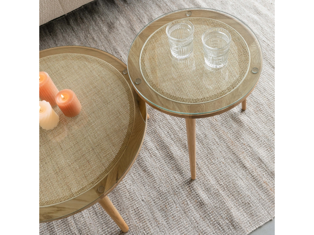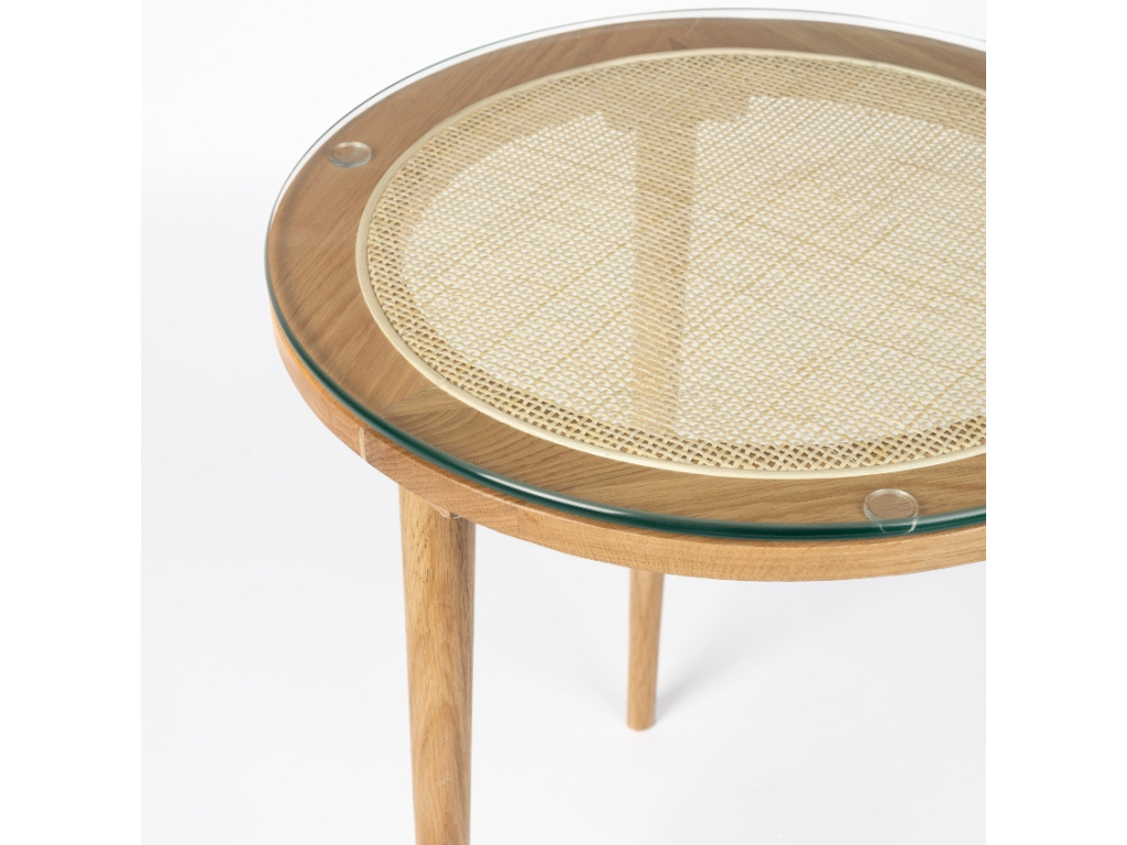 Dubový odkládací stolek HARU je ozvláštněn jemným ratanovým výpletem, který je chráněn skleněnou deskou. Tento designový kousek skvěle doplní rustikální interiéry i interiéry zařízené ve stylu scandi – ve společnosti přírodních materiálů mu to bude slušet nejvíce. Dopřejte vašemu obývacímu pokojí stylové místo, na které můžete naaranžovat oblíbené dekorace a svíčky nebo vázu s květinami. V sérii HARU navíc najdete také kulatý a obdélníkový konferenční stolek, které se budou v interiéru skvěle doplňovat.