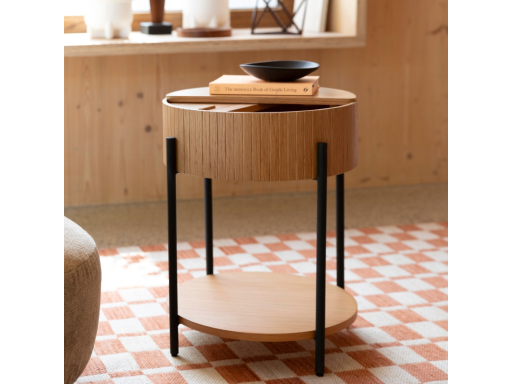 Odkládací stolek SLIDES představuje nejen stylové místo k vystavení dekorací, ale také k uschování drobností a cenností. Ty můžete skrýt do úložného prostoru, který se důmyslně ukrývá pod vrchní deskou stolku. Ve spodní části jeho podnože navíc najdete praktickou odkládací polici. Použitá dubová dýha skvěle zapadne do přírodně laděných obývacích pokojů, stolek ale nemusíte umístit jen tam! Co takhle využít ho v předsíni? Poslouží vám třeba k odkládání klíčů i k uskladnění čepic a rukavic. V sérii SLIDES navíc najdete také toaletní stolek, se kterým se budou stylově doplňovat.