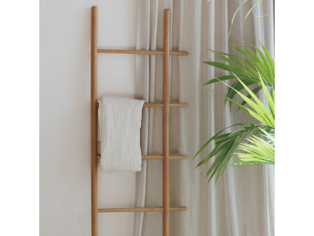 Odkládací žebřík JHON od značky White Label Living je skvělým a multifunkčním pomocníkem do každé domácnosti. JHON je vyroben z masivního dubového dřeva, které se pyšní svou pevností, odolností a přirozenou krásou. Jeho minimalistický design skvěle zapadne do interiérů v moderním, skandinávském či boho stylu. Tento univerzální kousek se stane nepostradatelným pomocníkem – ať už ho využijete jako odkládací prostor na oblečení, ručníky nebo pro zavěšení svých oblíbených dekorací.