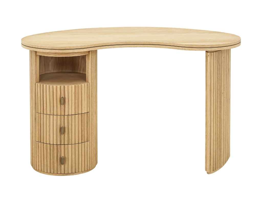 Pracovní stůl Belfort zaujme svou kombinací elegance a hravosti díky organickému tvaru a lamelovému povrchu z dubové dýhy. Tři zásuvky s mosaznými úchytkami a otevřená policie nabídnou praktický úložný prostor, se kterým budete mít vše po ruce. Jeho jemný přírodní vzhled skvěle vynikne v interiérech inspirovaných skandinávským stylem nebo Japandi estetikou. Díky prostorné pracovní desce se stane vaším oblíbeným místem pro práci, tvoření nebo plánování dne.