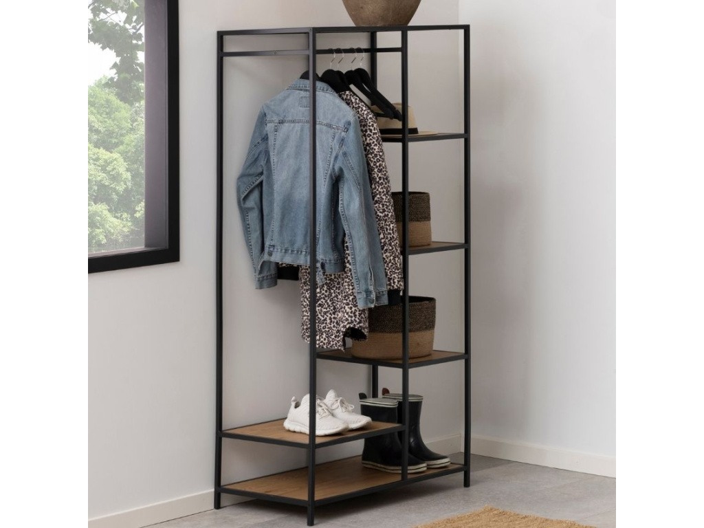 Regál Darila je minimalistický kousek, který doladí vaši předsíň. Regál má kovový rám a podnož, čtyři poličky a prostor na obuv, kabáty nebo na klobouky či čepice.