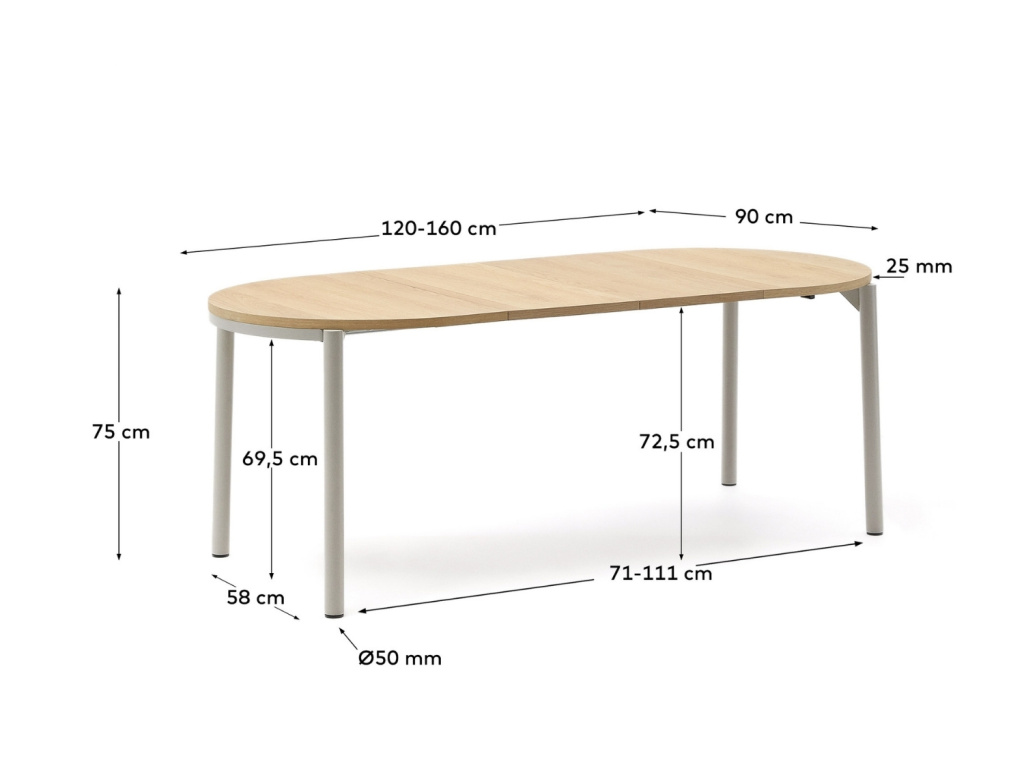 Rozkládací jídelní stůl Kave Home Montuiri se skvěle hodí do menších interiérů. Díky dvěma přiloženým rozkládacím deskám se ale kdykoliv snadno promění v prostorné místo pro více hostů. Přírodně zbarvená dubová dýha doplněná o světlou podnož se bude vyjímat ve světlejších rustikálních i scandi interiérech. Dopřejte s tímto stylovým kouskem vaší jídelně atraktivní středobod, u kterého se budete rádi scházet s rodinou i přáteli!