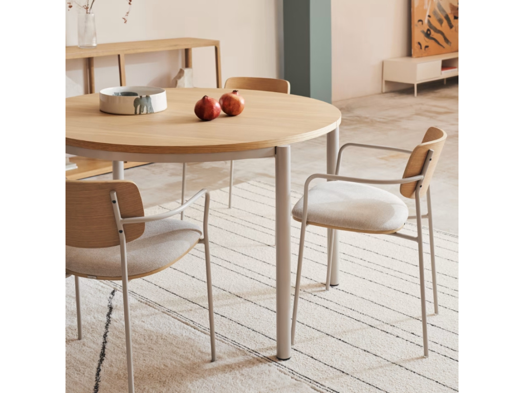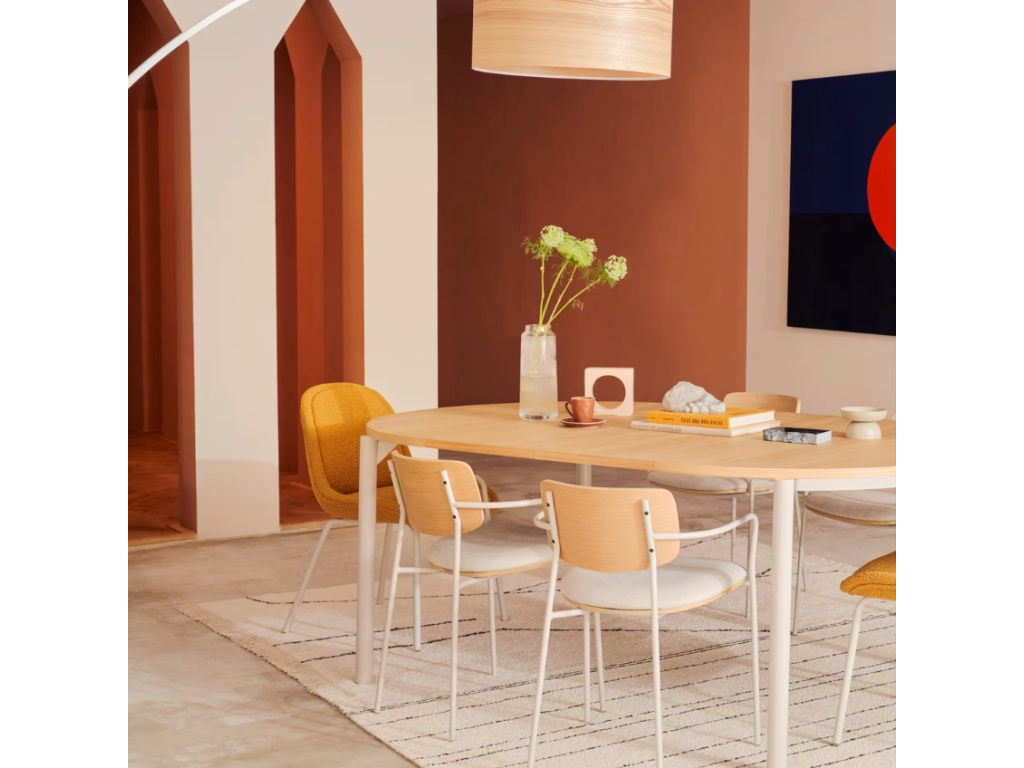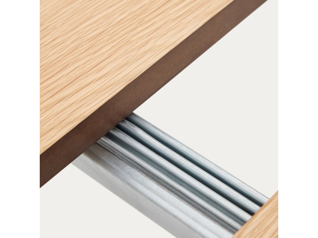 Rozkládací jídelní stůl Kave Home Montuiri se skvěle hodí do menších interiérů. Díky dvěma přiloženým rozkládacím deskám se ale kdykoliv snadno promění v prostorné místo pro více hostů. Přírodně zbarvená dubová dýha doplněná o světlou podnož se bude vyjímat ve světlejších rustikálních i scandi interiérech. Dopřejte s tímto stylovým kouskem vaší jídelně atraktivní středobod, u kterého se budete rádi scházet s rodinou i přáteli!