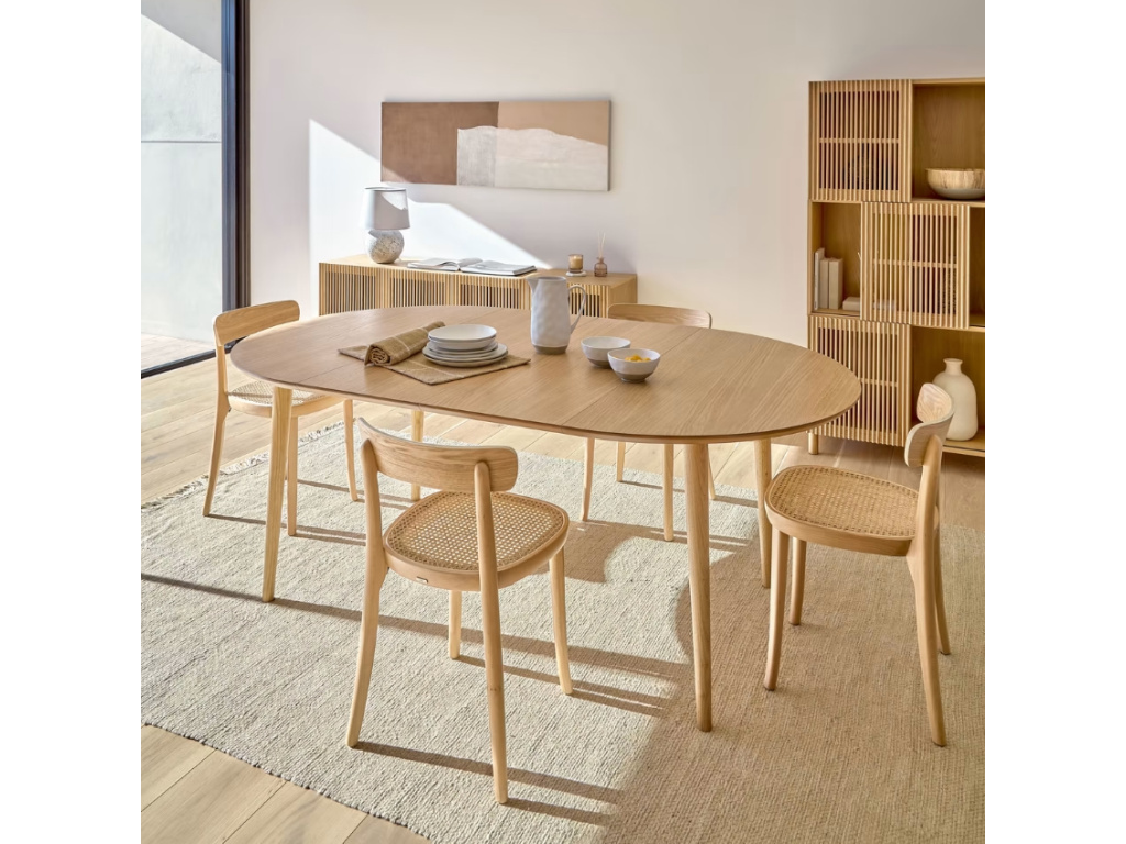 Rozkládací jídelní stůl Kave Home Oqui zaujme svým jednoduchým čistým designem a okamžitě se stane dominantou vaší jídelny. Tento rustikální kousek se perfektně hodí do stylově zařízených moderních i skandinávských domácností. Deska z přírodní dubové dýhy je doplněna masivní podnoží z kaučukového dřeva. Stůl je možné rozložit na šířku 200 centimetrů. Pohodlně se tak kolem něj usadí 8 stolovníků. Díky svým vlastnostem se produkt hodí i do komerčních prostor, jakými jsou restaurační zařízení či hotely.
