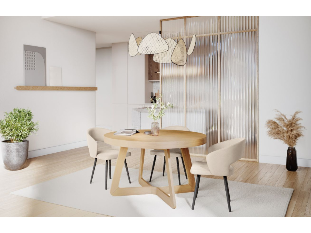 Jídelní stůl Dustin je dokonalou kombinací elegance, funkčnosti a moderního designu. Kulatá dýhovaná deska s možností rozložení snadno přemění stůl na oválný, čímž vytvoří dostatek prostoru až pro 8 osob. Stabilní masivní podnož s originálním tvarem dodá nábytku jedinečný charakter a pevnost, zatímco zakřivené linie přinesou lehkost a sofistikovaný vzhled. Tento stůl skvěle zapadne do moderních i klasických interiérů, kde se stane stylovým centrem jídelny či obývacího prostoru. Perfektně ladí s jídelními židlemi se sametovým nebo čalouněným potahem, se kterými vytvoří elegantní a vkusný celek. Užijte si rodinné večeře i setkání s přáteli u stolu, který spojuje praktičnost s nadčasovým designem.
