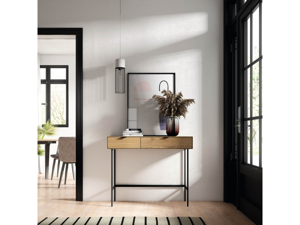 Toaletní stolek představuje nadčasový kus nábytku v designové sérii TULSA od značky Somcasa. Stolek se pyšní minimalistickým funkčním designem, který představuje nesmrtelnou kombinaci dřeva a kovu. Korpus je vyroben z dubové dýhy a doplňují ho dvě praktické zásuvky z dubového masivu, které disponují měkkým zavíracím systémem Soft closing. Zásuvky využijete například na své oblíbené šperky, drobnosti a doplňky. Stabilitu stolku zajišťuje lakovaná kovová podnož, jež působí lehkým vzdušným dojmem. Kombinace přírodního dřeva a černého kovu působí elegantně a vnese do prostoru svěží nádech. Stolek se bude skvěle vyjímat v interiérech, laděných do moderního či skandinávského stylu. Bude mu to slušet také spolu s dalšími doplňky ze stejnojmenné kolekce.