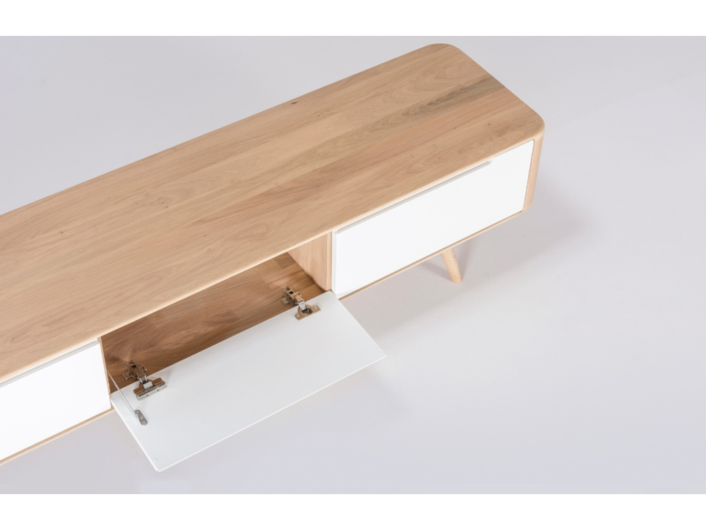 TV stolek Ena od značky Gazzda v sobě propojuje nadčasový design a precizní zpracování s důrazem na každý detail. Jeho konstrukce je vyrobena z masivního naolejovaného dubového dřeva, která je doplněna o dvě zásuvky a výklopná dvířka z MDF. Tento elegantní kousek fantasticky zapadne do všech minimalistických či skandi interiérů. Série Ena nabízí i další úložné prostory v podobě TV stolků a komod – vytvořte si jedinečný set, který dodá vašemu domovu styl!