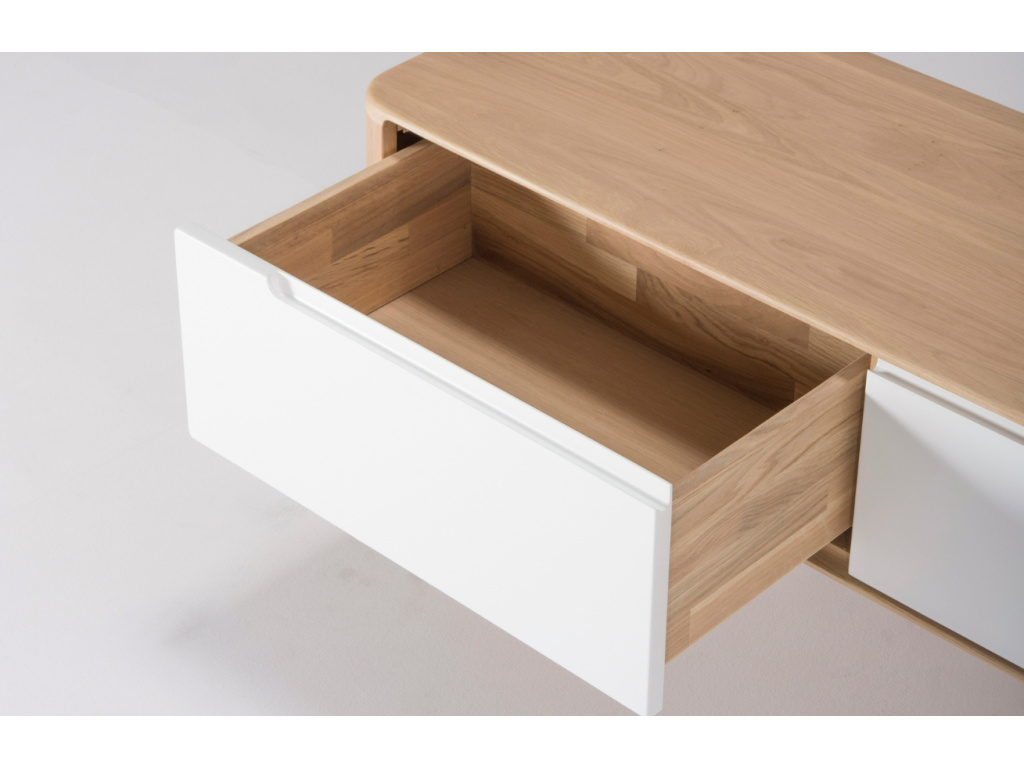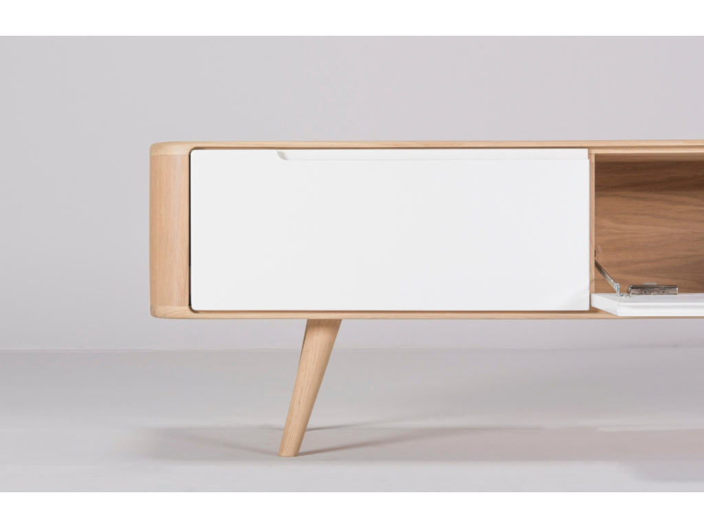 TV stolek Ena od značky Gazzda v sobě propojuje nadčasový design a precizní zpracování s důrazem na každý detail. Jeho konstrukce je vyrobena z masivního naolejovaného dubového dřeva, která je doplněna o dvě zásuvky a výklopná dvířka z MDF. Tento elegantní kousek fantasticky zapadne do všech minimalistických či skandi interiérů. Série Ena nabízí i další úložné prostory v podobě TV stolků a komod – vytvořte si jedinečný set, který dodá vašemu domovu styl!
