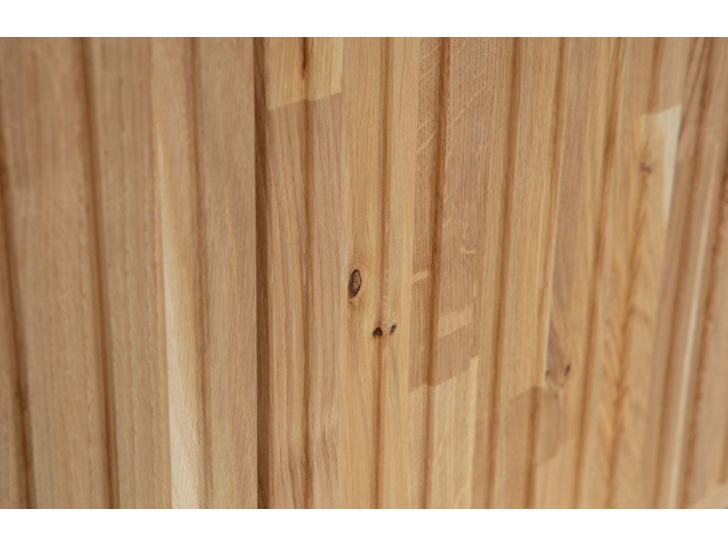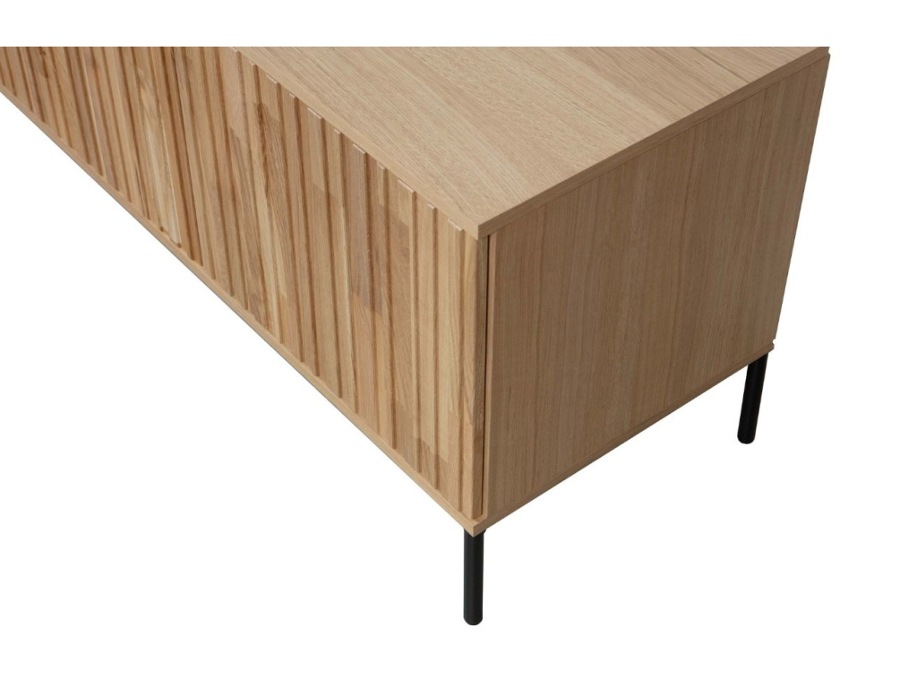 Přírodní TV stolek Gravia ze stejnojmenné řady nábytku nabízí jedinečný design a praktický úložný prostor v podobě čtyř prostorných polic. Police jsou schovány za třemi dvířky se systémem otevírání push to open. Zajímavý motiv žebrování podtrhne celkový dojem stolku a dodá mu elegantní a rustikální vzhled. Přírodní odstín dubové dýhy vnese do vašeho obývacího pokoje pocit tepla a útulna. Jemná inspirace retro stylem dodá celému prostoru osobitý charakter.