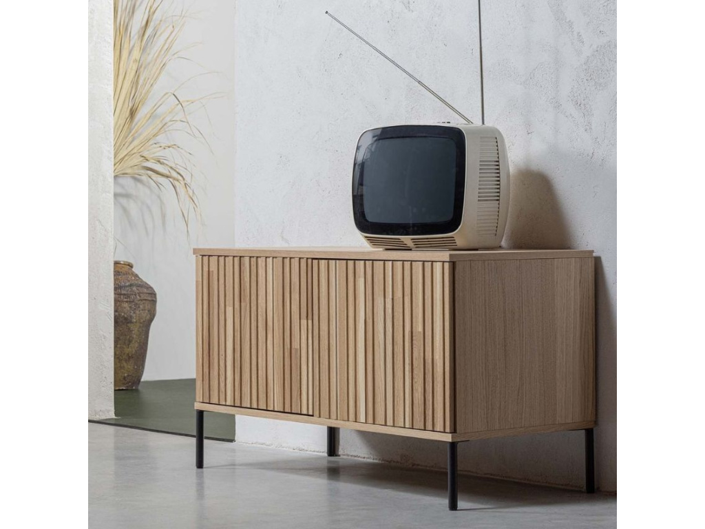 Přírodní TV stolek Gravia ze stejnojmenné řady nábytku nabízí jedinečný design a praktický úložný prostor v podobě čtyř prostorných polic. Police jsou schovány za třemi dvířky se systémem otevírání push to open. Zajímavý motiv žebrování podtrhne celkový dojem stolku a dodá mu elegantní a rustikální vzhled. Přírodní odstín dubové dýhy vnese do vašeho obývacího pokoje pocit tepla a útulna. Jemná inspirace retro stylem dodá celému prostoru osobitý charakter.