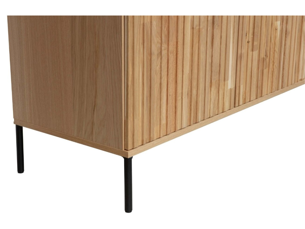TV stolek Gravia ze stejnojmenné řady nábytku nabízí jedinečný design a praktický úložný prostor v podobě šesti prostorných polic. Police jsou schovány za třemi dvířky se systémem otevírání push to open. Zajímavý motiv žebrování podtrhne celkový dojem stolku a dodá mu elegantní a rustikální vzhled. Přírodní odstín dubové dýhy vnese do vašeho obývacího pokoje pocit tepla a útulna. Jemná inspirace retro stylem dodá celému prostoru osobitý charakter.