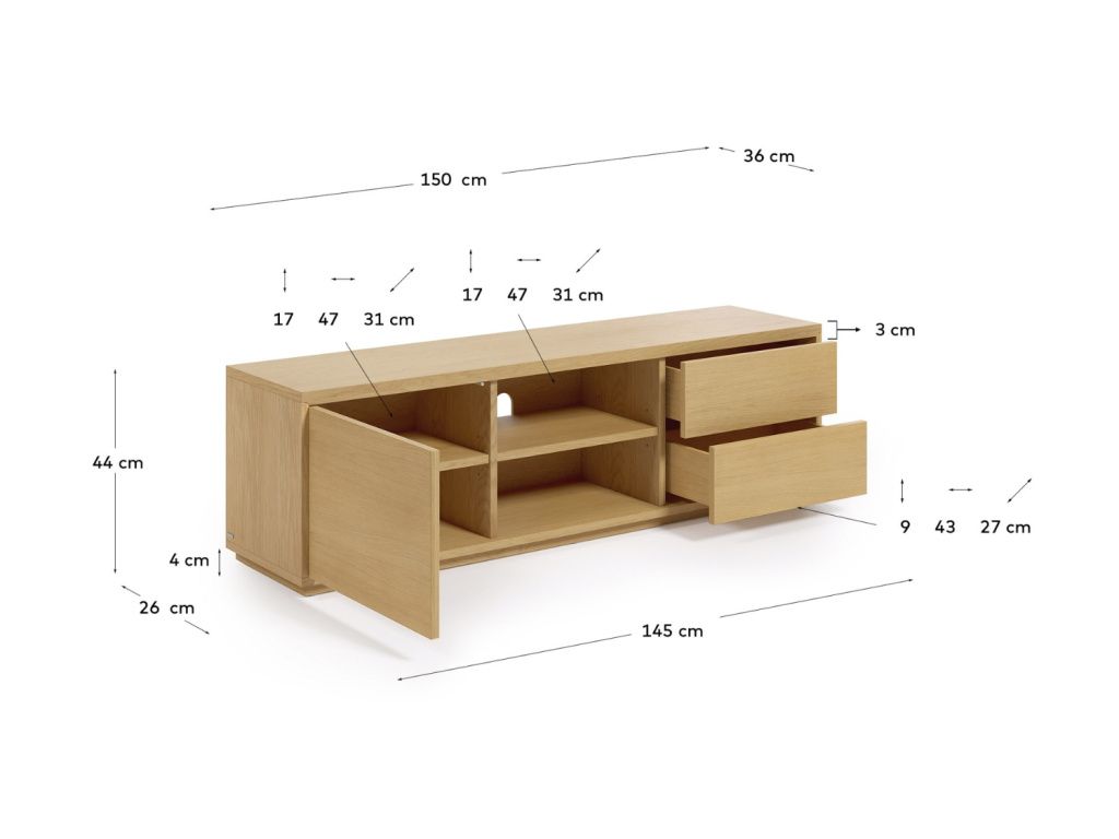 Jednoduchý designový TV stolek Kave Home Abilen s povrchem z dubové dýhy, bude ideálním designovým úložným prostorem pro váš obývací pokoj. Světlá barva zapadne do skandinávských i minimalistických interiérů. Praktické 2 zásuvky, prostorná skříňka a 2 poličky s otvorem pro kabely umožní udržet pořádek.