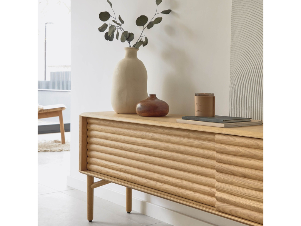 Televizní stolek Kave Home Lenon je nádherným designovým kouskem do moderních a skandinávských interiérů. Je vyrobený z masivního dubového dřeva a dubové dýhy. V polovině oddělaná police je ukrytá za posuvnými dvířky, které mají z čela atraktivně vyřešené zdobení. Nechybí ani otvor pro protažení kabelů. Stolek má certifikát FSC a SMETA, což značí kvalitní zpracování, šetrnou a ekologickou výrobu. Hodí se do skandinávských interiérů s přírodními prvky.