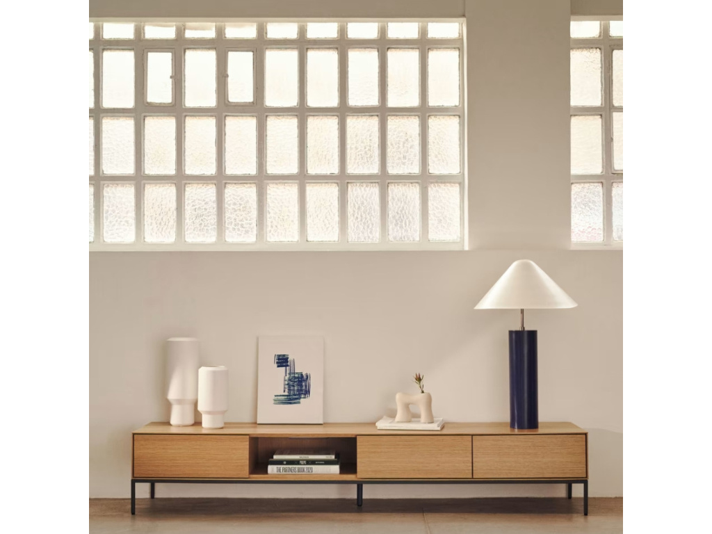 TV stolek Vedrana pochází ze stejnojmenné série nábytku vytvořeného týmem Kave Home. Tyto úložné prostory jsou velice praktické a skvěle se hodí do industriálních i minimalistických interiérů. Spojení dubové dýhy a vyšší kovové podnože je nejen nadčasové, ale hlavně velice atraktivní. Tento široký TV stolek vám umožní uspořádat váš inventář do tří zásuvek se systémem otevírání push to open a prostorné otevřené police. Sjednoťte úložné prostory ve vaší domácnosti a vpusťte do ní sérii Vedrana! Vybírat můžete z komod a TV stolků různých velikostí, všechny jsou dostupné v provedení dub i ořech.