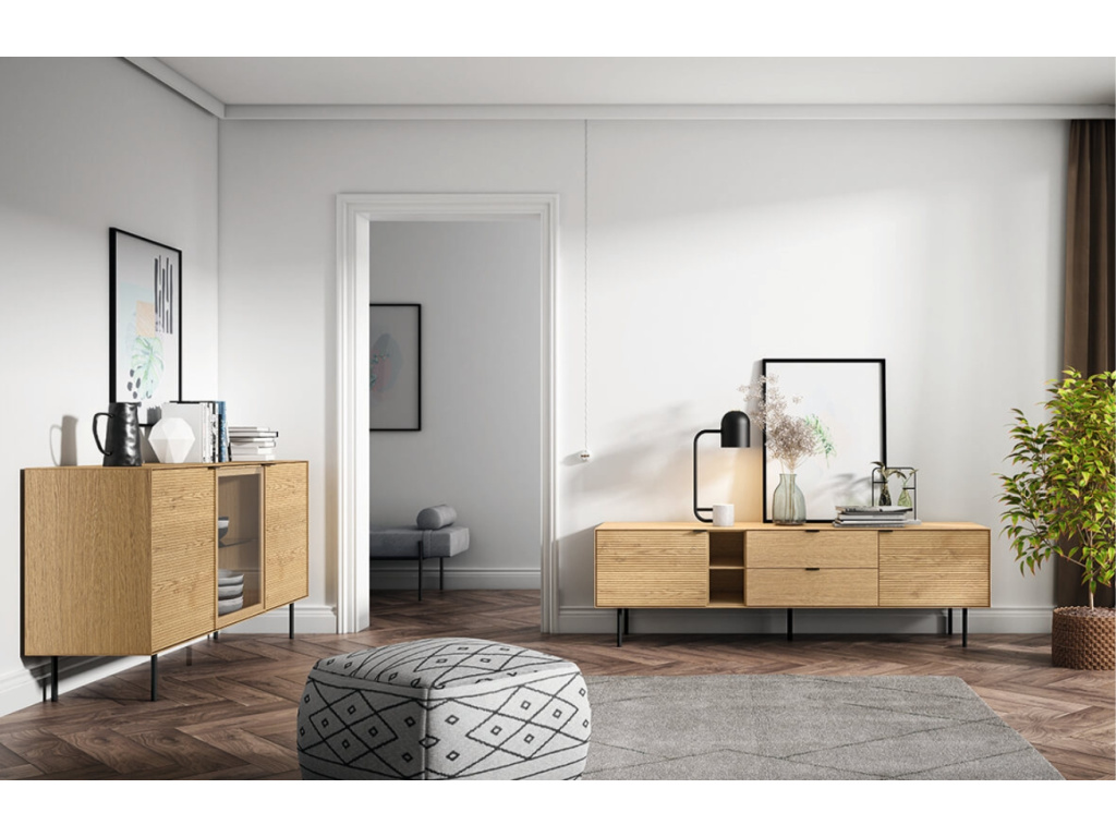 Dubový TV stolek Somcasa Tulsa vnese do vašeho domova moderní nádech a skandinávský styl. Stolek se pyšní funkčním designem, který představuje nesmrtelnou kombinaci dřeva a kovu. Přírodní odstíny dřeva spolu s černým kovem dodají stolku patřičnou eleganci. Korpus je vyroben z dubové dýhy a doplňují ho dvířka a zásuvky z masivu s měkkým zavíracím systémem Soft closing. Stolek disponuje dostatkem úložného prostoru na vaše oblíbené doplňky a inventář. Prostorné místo na stolku můžete kromě televize také využít na oblíbené dekorace či květiny. Stabilitu zajišťuje lakovaná kovová podnož, jež působí lehkým vzdušným dojmem. Tento stylový kousek se bude skvěle vyjímat v moderním i industriálně laděném interiéru, kde ho nejlépe doplní nábytek ze stejnojmenné kolekce.
