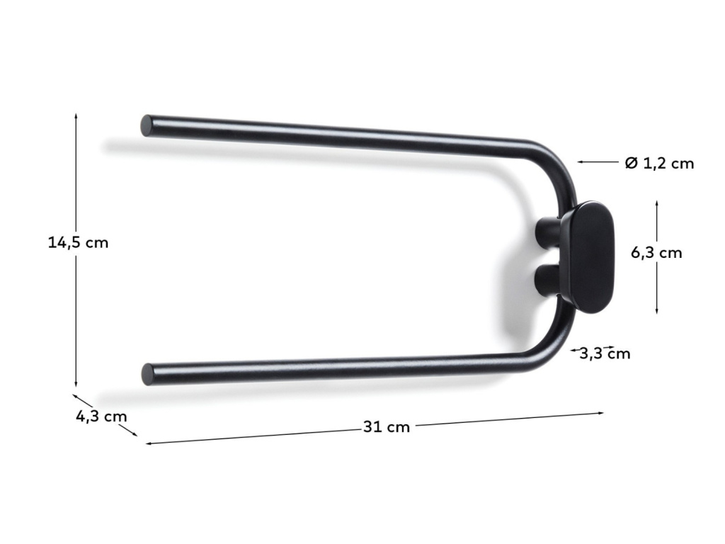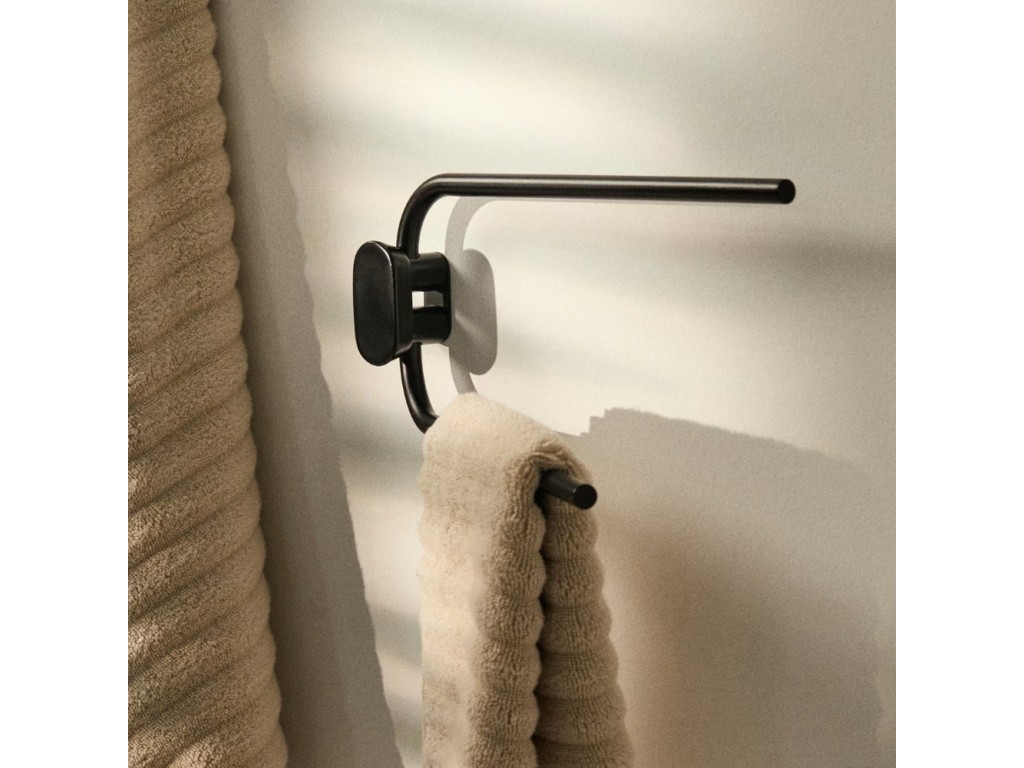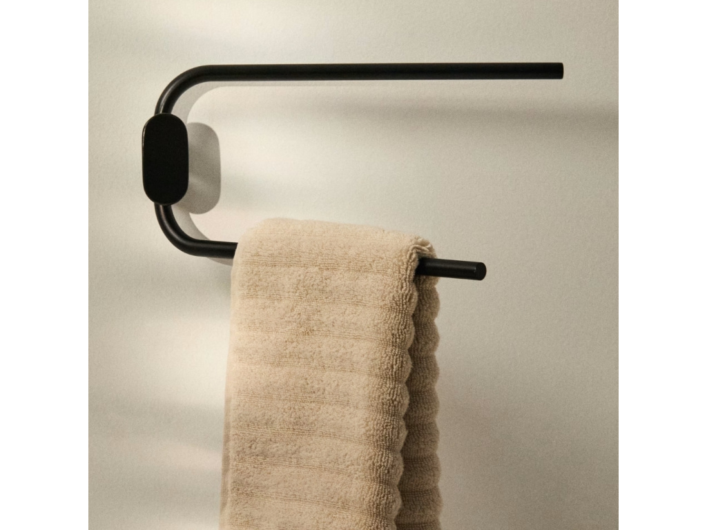 Kovový držák Arely bude praktickým a stylovým doplňkem do každé koupelny. Minimalistická konstrukce v matně černé barvě působí elegantně a poskytuje dostatek prostoru pro pohodlné zavěšení dvou ručníků nebo utěrek. Série Arely vytvořilo studio Nahtrang a nabízí více druhů držáků a jiných doplňků, takže si můžete vytvořit ucelený a sladěný set, který dodá vašemu interiéru jednotný a moderní vzhled.