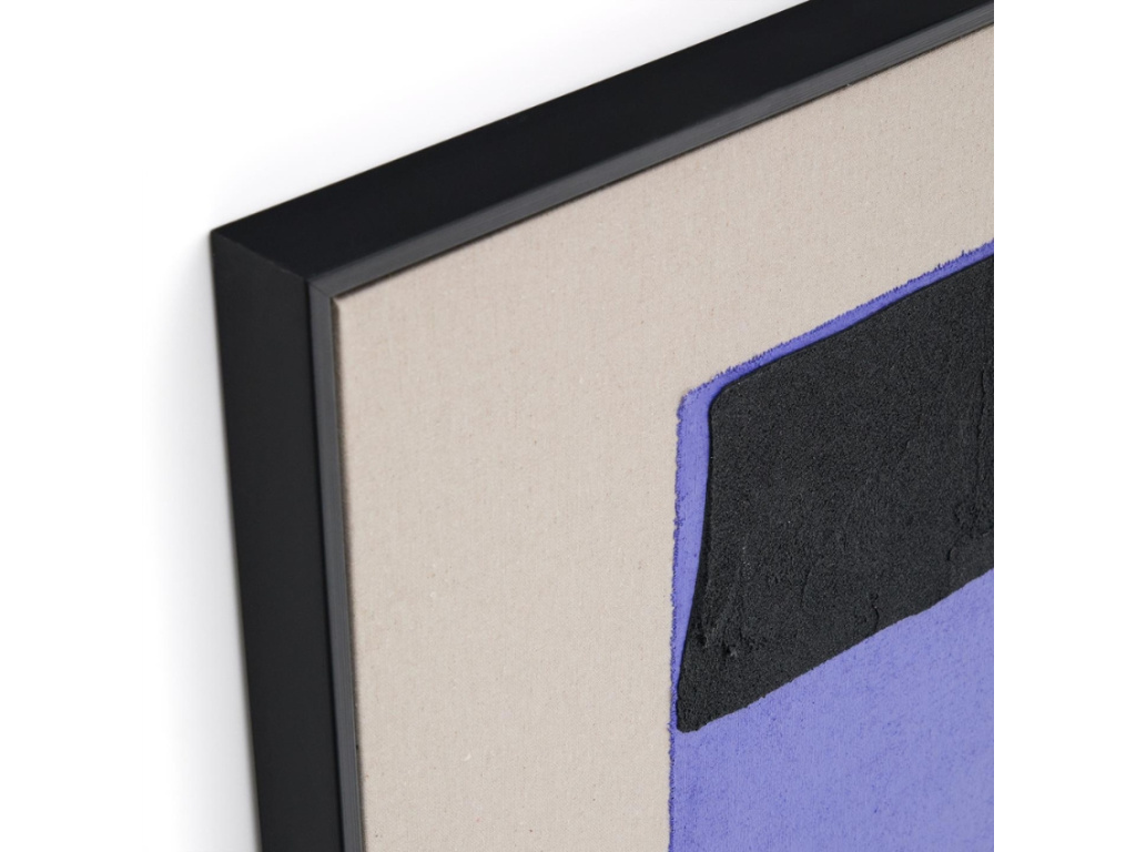 Abstraktní obraz Zernu zaujme hrou kontrastů – černá barva v kombinaci s fialovou vytváří vizuálně silnou kompozici s efektem světla a stínu. Ruční malba je vytvořena na lněném plátně, jehož povrch je navíc chráněn lakem, což zajišťuje dlouhou životnost a odolnost proti prachu. Díky výrazné textuře, kde se střetává hrubost malby s jemností tkaniny, každý kus přirozeně vynikne jako solitér – nebo vytvoří působivý set spolu s dalšími obrazy z této kolekce. Rám v černé barvě dodává celé kompozici čistý výraz a díky praktickému háčku na zadní straně je zavěšení velice snadné.