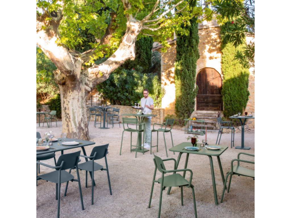 Barový stůl pochází z ikonické kolekce Luxembourg, která je typická pro lamelový design a trendy odstíny. Hliníková podnož se skládá ze čtyř trubek, které se sbíhají do jednoho celku, což vytváří neotřelý detail, a čtvercová základna zajišťuje výbornou stabilitu celého stolu. Uprostřed lamelové desky je díra na slunečník, který dopřeje komfort během slunných dnů. Stůl se bude skvěle vyjímat v komerčních prostorech jako jsou kavárny, bistra a restaurace. Vyrábí se z prvotřídních materiálů a je testován tak, aby splňoval standardy kvality evropských norem (NF EN 581-1 a NF EN 581-2). Exkluzivní systém antikorozní úpravy pro venkovní použití a anti-UV práškový lak (standardizované testy AFNOR) dělají ze stolu unikátní kousek, který snadno zkombinujete s dalšími produkty z řady Luxembourg.